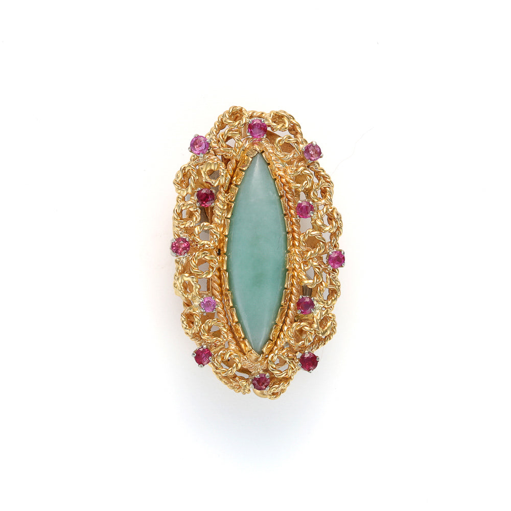 Yellow 14 Karat Filigree Design Pin With One 25.00X7.33Mm Marquise Green Jade And 12=0.48Tw Round Rubys "This item is an estate piece of jewelry, often one-of-a-kind, and has been previously owned. It has been refurbished by our master jewelers to be enjoyed again."
