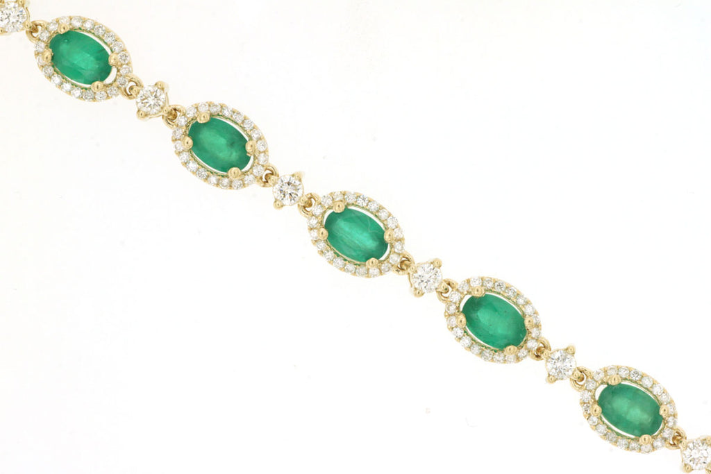 Indulge in the luxury of the Royal Jewelry Manufacturing Inc. Color Gemstone Bracelet, a masterpiece in fine jewelry design. Crafted from opulent 14 Karat Yellow Gold, this stunning bracelet showcases 13 captivating oval emeralds, together weighing an impressive 5.70 carats. These emeralds, each exhibiting a vivid green hue, are elegantly accompanied by 2.00 carats of dazzling round diamonds, renowned for their clarity and brilliance. The sleek, sophisticated design is completed with an innovative hidden plunger clasp, ensuring both secure wear and a seamless look.