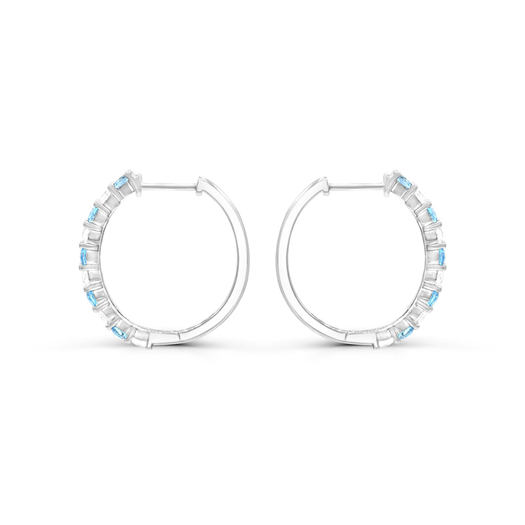 Introducing the exquisite ReMARKable Designs Color Gemstone Earrings, a stunning creation that radiates elegance and sophistication. These medium hoop earrings are crafted in lustrous sterling silver, featuring a dazzling combination of 10 round lab-created spinels in a mesmerizing blue hue and 10 round lab-created sapphires in pristine white. The hinged snap closure ensures a secure fit, providing ease of wear while maintaining a sophisticated style that complements any occasion.
