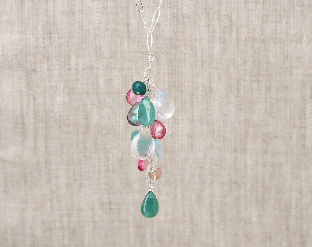 Color Gemstone Necklace in Sterling Silver White Various Shapes Grandidierite Various Shapes Rose Quartz Various Shapes Pink Sapphire Various Shapes Blue Topaz Chain Type: Paperclip Chain Length: 18 Clasp Type: Lobster Claw Necklace Type: Drop