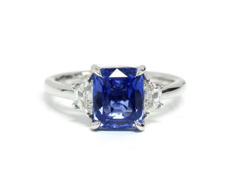 Experience the unparalleled elegance and refined craftsmanship of the AFFORADABLE GEMS (NY) CORP. Color Gemstone Ring. This luxurious piece showcases a breathtaking 3.14 carat cushion-cut sapphire, whose deep blue hues mesmerize with every glance. It is beautifully complemented by two radiant trapezoid diamonds with a total weight of 0.43 carats, enhancing the sapphire's enchanting glow with their natural brilliance. Each gemstone is meticulously selected and evaluated by graduate gemologists, ensuring exceptional quality and clarity.