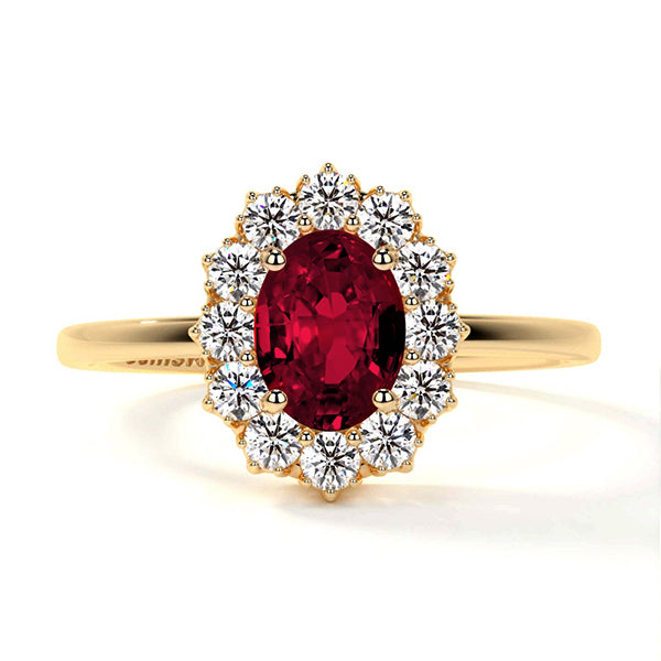 Immerse yourself in the captivating allure of the AFFORADABLE GEMS (NY) CORP. Color Gemstone Ring, a true testament to vibrant elegance and luxury. This magnificent piece features a breathtaking 7.00-carat oval ruby, celebrated for its deep, enchanting hue, and is set in luxurious 14 Karat yellow gold. Twelve hand-selected round natural diamonds, with a total weight of 0.36 carats, surround the central ruby, their brilliance and clarity amplifying the ruby's vivid color and adding a touch of dazzling sparkle.