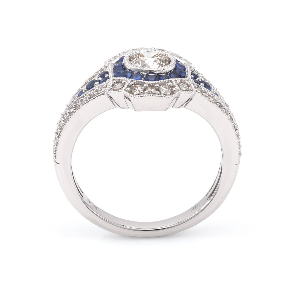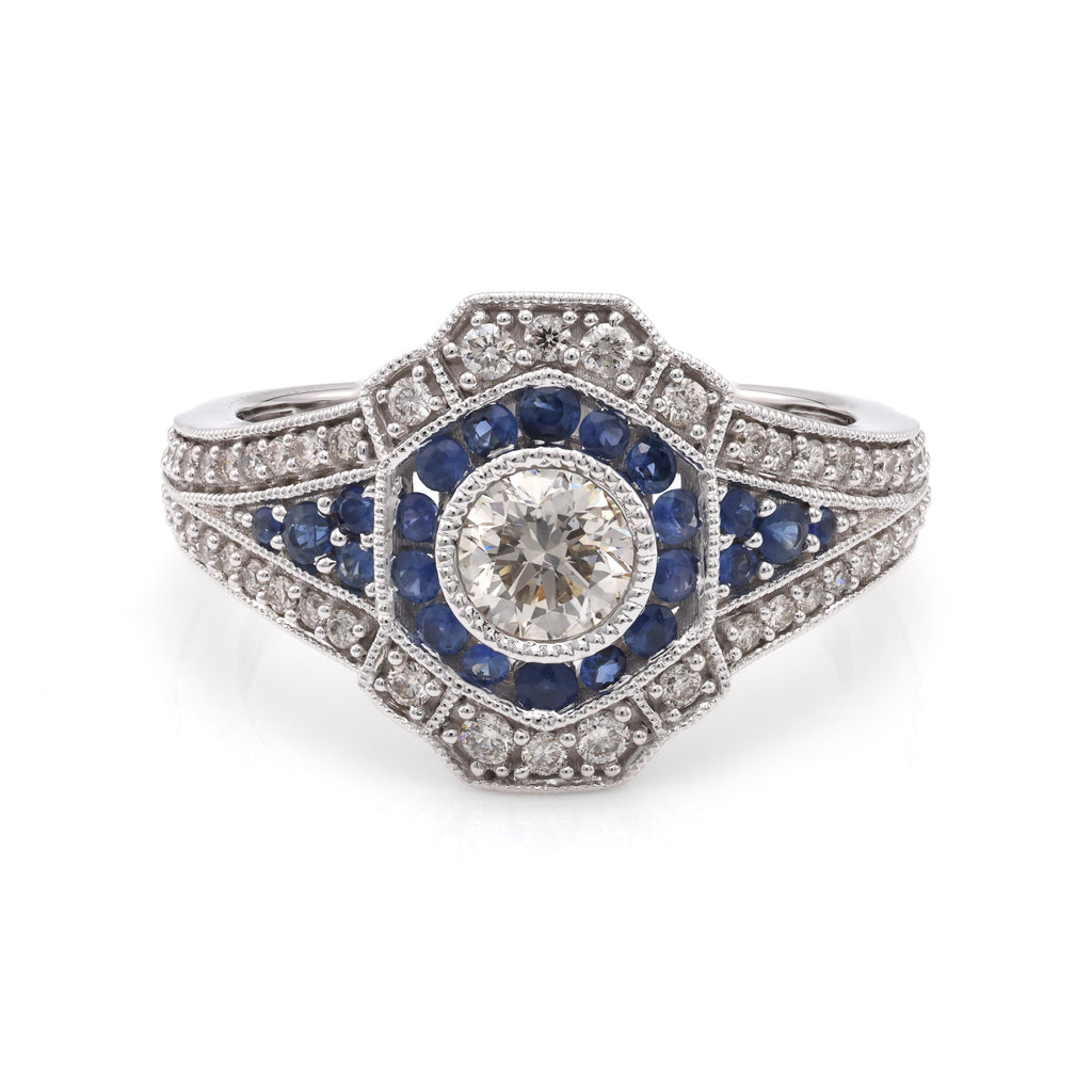 The sapphire is beautifully complemented by 0.72 carats of round diamonds, each hand-selected by our expert graduate gemologists for their exceptional clarity and brilliance. Although specific clarity details are not provided, rest assured that we only utilize the finest natural diamonds, ensuring every piece is unique.