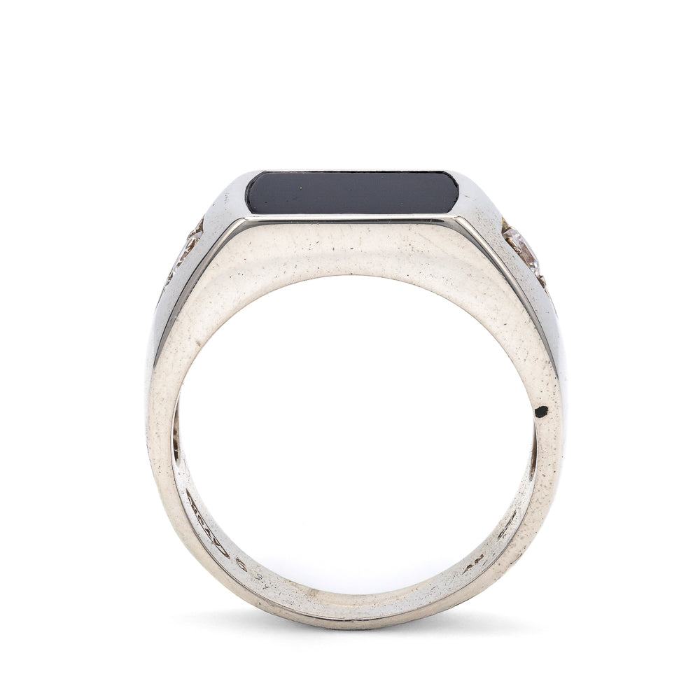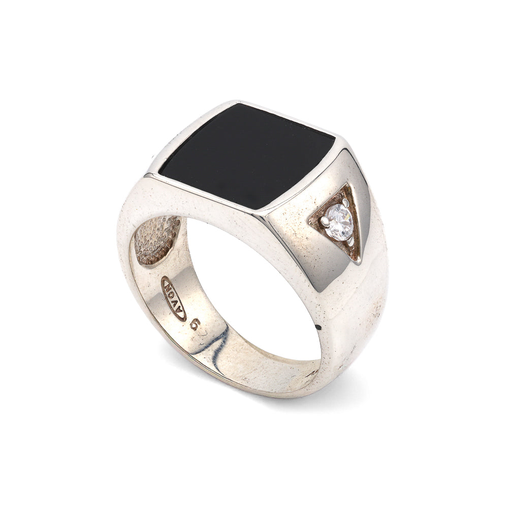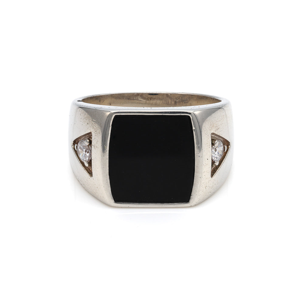 Discover the allure of timeless elegance with our Men's Fashion Ring from Marks Jewelers, exquisitely crafted in sterling silver with a radiant white finish. This one-of-a-kind estate piece features two dazzling round cubic zirconiums flanking a striking fantasy cut onyx at its center. Each stone is meticulously set to enhance its natural beauty and sparkle, creating a captivating contrast that is sure to turn heads. Refurbished by our master jewelers, this ring offers a harmonious blend of sophistication and heritage, making it an ideal choice for those seeking a unique piece with a story. Measuring 13.33mm in width and available in size 9, this ring promises a perfect fit and comfortable wear. Whether celebrating a personal milestone or simply indulging in a meaningful self-gift, this sterling silver treasure is designed to be cherished for years to come. Embrace the elegance of the past reimagined for today and add this exceptional piece to your collection. Don't miss the opportunity to own a piece of history-secure your estate fashion ring now and let it be a testament to your exquisite taste.This item is an estate piece of jewelry, often one-of-a-kind, and has been previously owned. It has been refurbished by our master jewelers to be enjoyed again.