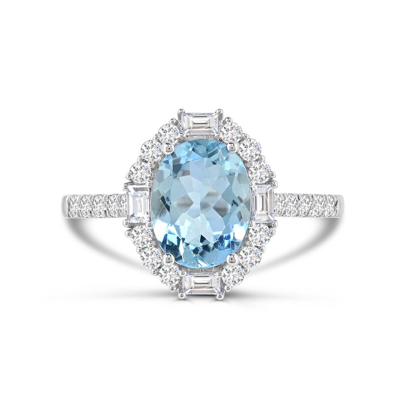 Discover the captivating beauty of the AFFINITY DESIGNS LLC Color Gemstone Ring, where elegance meets timeless sophistication. At its heart lies a magnificent oval aquamarine, measuring 9mm x 9mm, exuding a serene blue hue that captivates and enchants. This stunning centerpiece is accompanied by two baguette diamonds and one round diamond, boasting a combined natural weight of 0.67 carats, ensuring a sparkling brilliance that endures through time.