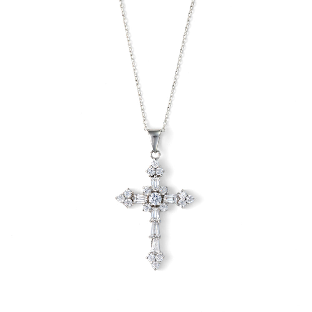 Cross Simulated Diamond Necklace in Sterling Silver White with 23 Various Shapes Cubic Zirconiums Chain Length: 16 Chain Type: Cable Link Clasp Type: Spring Ring Collection: M Estate "This item is an estate piece of jewelry, often one-of-a-kind, and has been previously owned. It has been refurbished by our master jewelers to be enjoyed again."