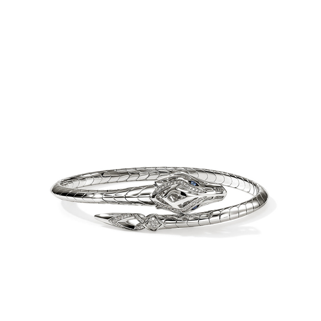 Color Gemstone Bracelet in Sterling Silver White with 2 Round Sapphires, Color: Blue Round Diamond, Color: G/H, Clarity: SI1, totaling 0.22ctw Length: 6.75 Clasp Type: No Clasp Bracelet Type: Cuff
