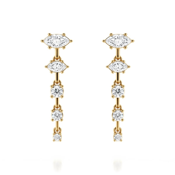 Elevate your elegance with the Noam Carver Drop Natural Diamond Earrings, crafted by the esteemed jeweler Noam Carver. These stunning earrings embody timeless beauty and exceptional craftsmanship, making them a perfect addition to any jewelry collection. Featuring a striking combination of natural diamonds, this pair includes 4 marquise diamonds totaling 0.73 carats and 6 round diamonds totaling 0.35 carats, all with G/H color and SI2 clarity. These attributes ensure a dazzling brilliance that distinguishes them from lab-grown alternatives. Fashioned from luxurious 14 Karat Yellow Gold, these earrings offer a warm and inviting glow that complements any ensemble. Designed with both comfort and security in mind, the friction back closure ensures ease of wear, making them suitable for any occasion, day or night. Priced at $5495.00, these earrings are a symbol of luxury and a celebration of life's special moments. Whether you're treating yourself or choosing a meaningful gift for a loved one, these earrings add an undeniable touch of sophistication and elegance. Experience the unmatched quality and artistry of Noam Carver. Don't miss the chance to enhance your jewelry collection with this exquisite piece-shop now and make a statement of timeless beauty.