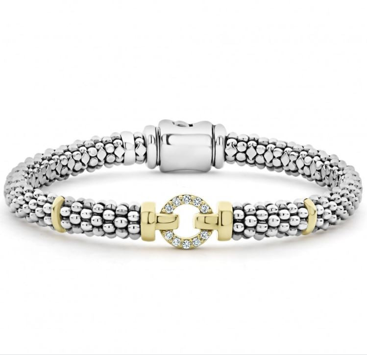 Elevate your jewelry collection with the LAGOS Enso Collection Earth Mined Diamond Bracelet, a stunning testament to elegance and craftsmanship. This luxurious bracelet is meticulously crafted from sterling silver, beautifully complemented by the rich tones of 18 Karat white and yellow gold. The exquisite contrast between these metals perfectly captures a blend of timeless elegance and modern sophistication. Adorned with 0.12 carats of round, earth-mined diamonds, each stone is expertly set to enhance its dazzling brilliance and natural sparkle.