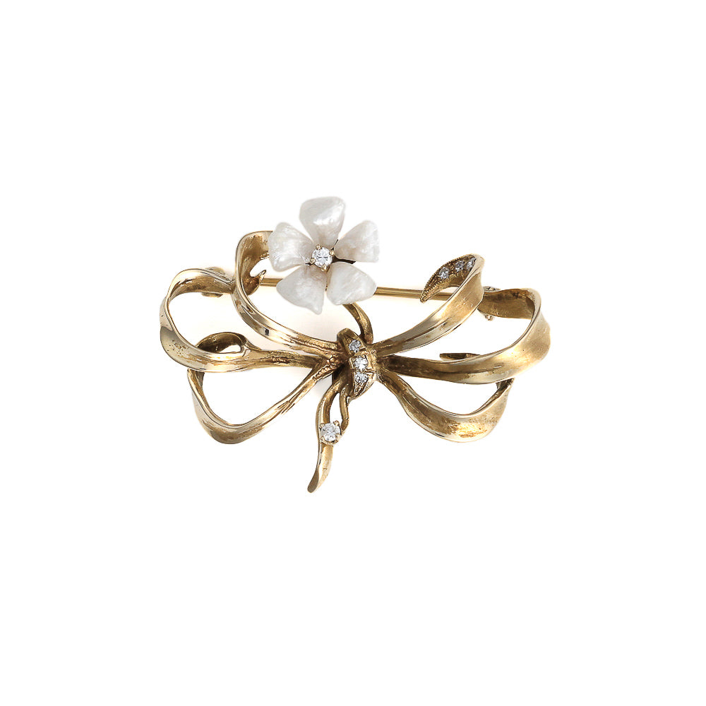 Experience the timeless elegance of our remarkable Estate Pin & Brooch, a unique offering from Marks Jewelers. This exquisite brooch is crafted in lustrous 14k yellow gold, forming a delicate floral bow motif that exudes sophistication. The piece is gracefully adorned with five luminous freshwater pearls and eight sparkling round diamonds, with a total diamond weight of 0.12 carats. These diamonds, selected by our in-house graduate gemologists, display a color grade of J/K and clarity of I1, ensuring a captivating sparkle. Each element of this one-of-a-kind estate piece has been expertly refurbished by our master jewelers, preserving its historical charm while enhancing its beauty. Perfect for adorning a lapel or complementing an evening gown, this brooch is more than just an accessory; it is a symbol of enduring beauty and refined taste. At Marks Jewelers, we understand that jewelry is an expression of personal milestones and cherished memories. This estate pin is a testament to that sentiment, offering both a connection to the past and a celebration of the present. Let this exquisite piece become a part of your story, adding its timeless allure to your collection. Embrace the legacy and sophistication of this estate brooch, and make it yours today. Visit Marks Jewelers to discover this and other extraordinary pieces that capture life's precious moments.This item is an estate piece of jewelry, often one-of-a-kind, and has been previously owned. It has been refurbished by our master jewelers to be enjoyed again.