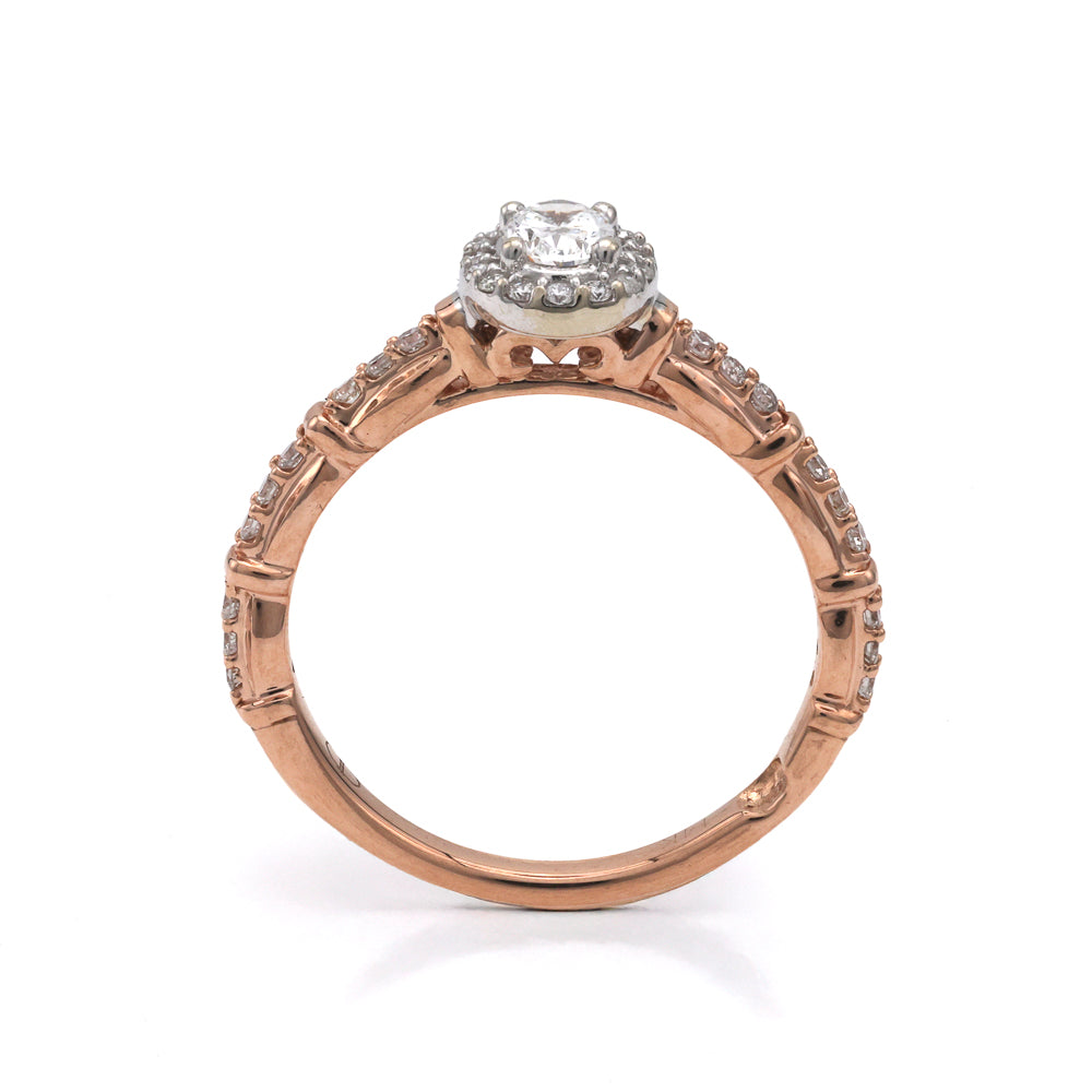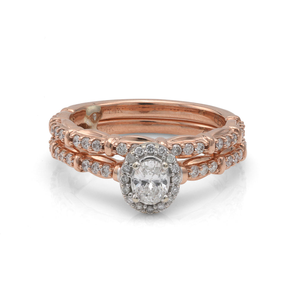 Introducing the Halo Natural Diamond Complete Wedding Set from Marks Estate Dept 1, a symbol of timeless elegance and love. This exquisite set is crafted in luxurious 14 karat rose gold, showcasing a stunning ensemble of natural diamonds in various shapes. With a total carat weight of 0.50, these diamonds possess a captivating color grade of G/H and clarity of I1, ensuring a radiant sparkle that captures attention.