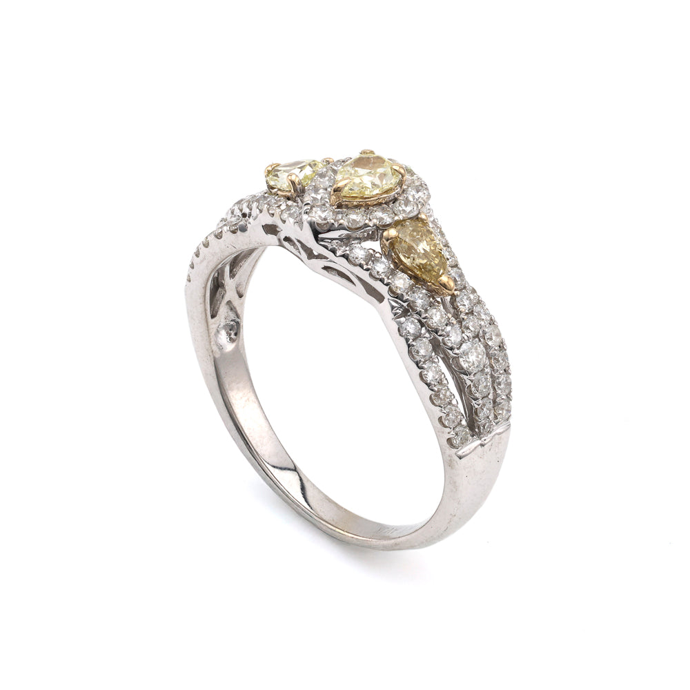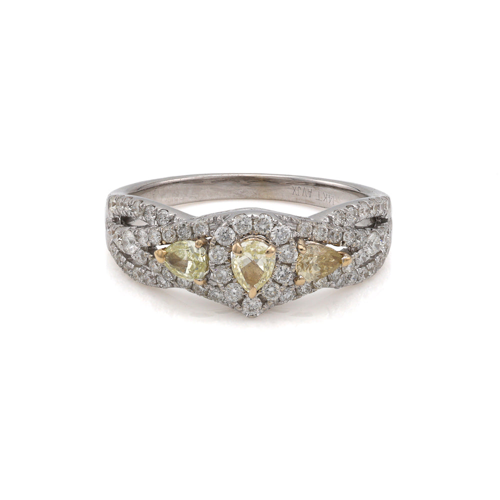 Immerse yourself in the timeless allure of the Halo Side Stone Natural Diamond Engagement Ring by Marks Estate Dept 1. This exquisite piece, a testament to superior craftsmanship, is artfully crafted in gleaming 14 Karat White Gold. At its core, three captivating pear-shaped natural diamonds radiate a warm yellow hue with clarity rated between SI2 and I1, collectively weighing 0.27 carats. These enchanting stones are beautifully complemented by 67 round brilliant diamonds, adding an extra 0.84 carats of dazzling sparkle, with a stunning H/I color and SI2-I1 clarity.
