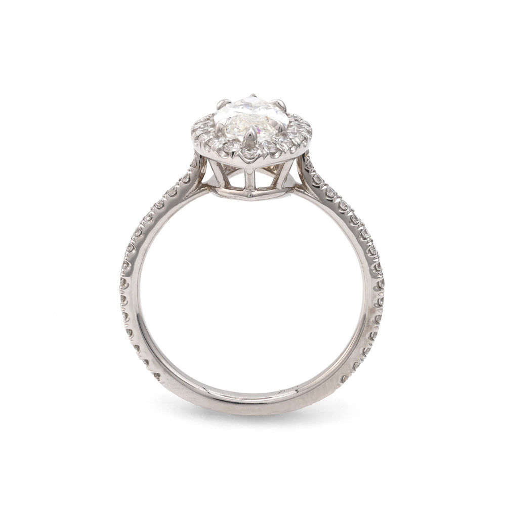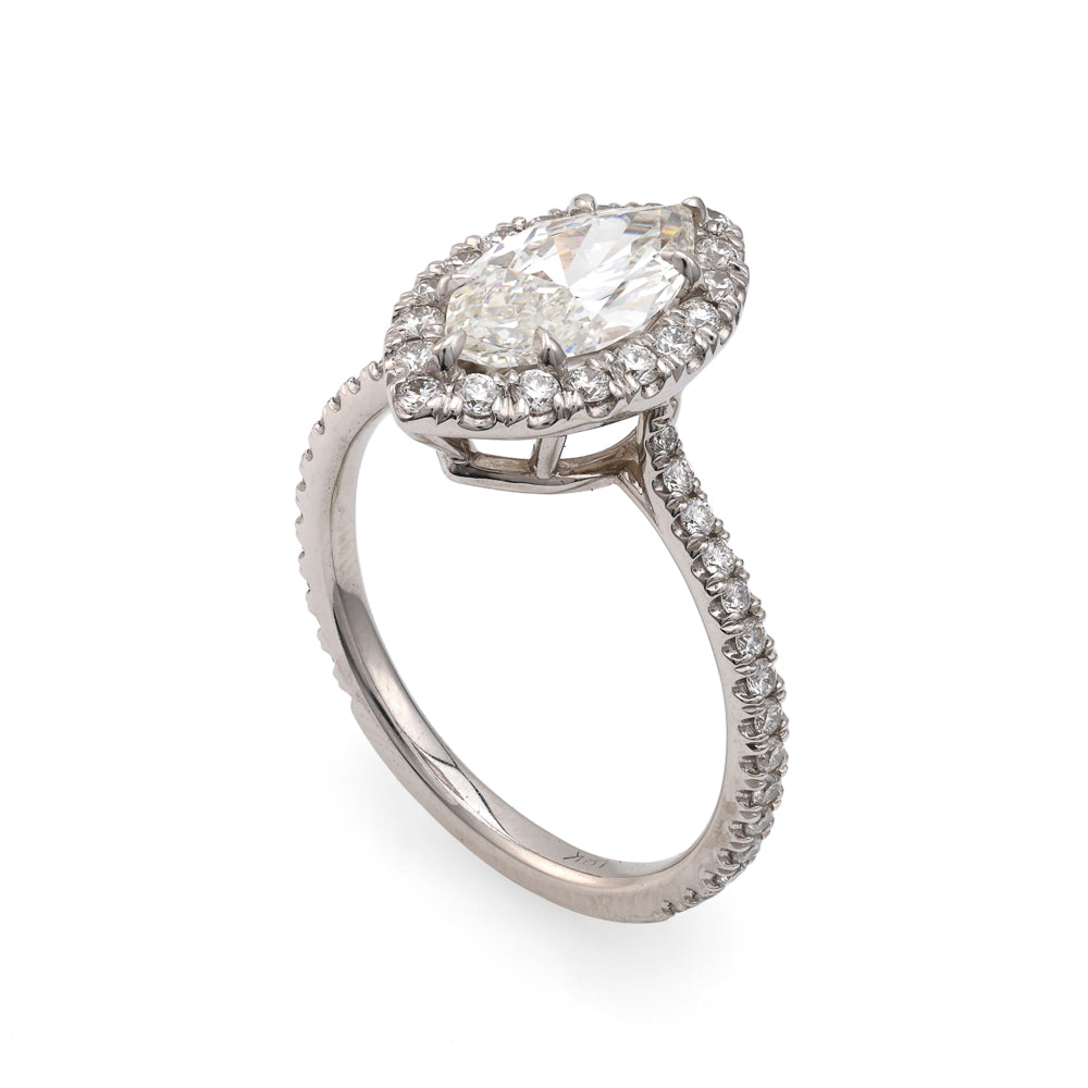 Halo Side Stone Natural Diamond Complete Engagement Ring in 18 Karat White with 1 Marquise Diamond, Color: I, Clarity: VS2, totaling 1.52ctw Round Diamond, totaling: 0.46ctw Ring Size: 8 MM Width: 2