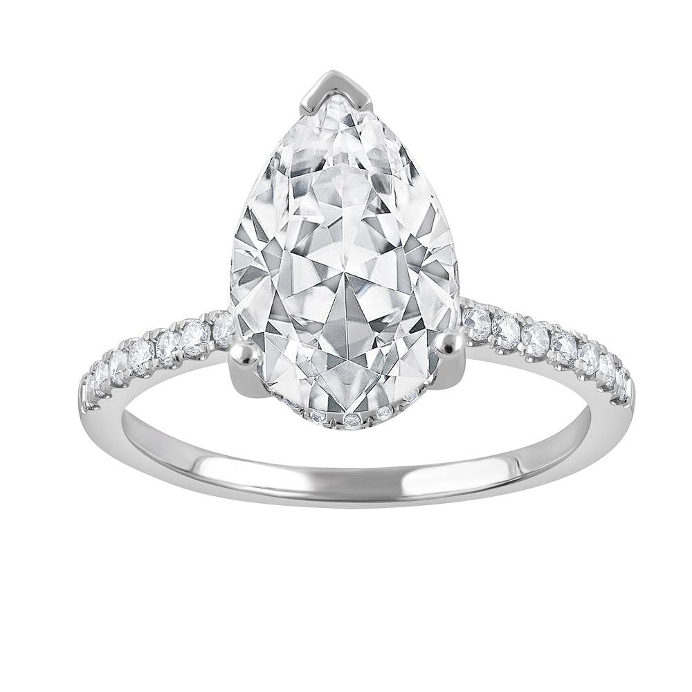 Discover the elegance and sophistication of the Hidden Accent Lab-Grown Diamond Complete Engagement Ring, expertly crafted by ReMARKable Designs. This exquisite piece features a stunning 1 Pear Lab-Grown Diamond, with a remarkable color grade of F and a clarity of VS1, totaling an impressive 3.03 carats. Accompanied by 38 Round Lab-Grown Diamonds with a color grade of F/G and clarity of VS, adding an additional 0.29 carats, this ring is a testament to the brilliance of lab-grown diamonds. Set in luxurious 14 Karat White gold, the ring exudes a timeless allure, perfect for marking significant moments in life. With a comfortable ring size of 7 and a sleek width of 2.1 mm, it offers both style and wearability. The lab-grown diamonds, created through advanced technology, provide an ethical and sustainable alternative to natural diamonds, ensuring that your choice reflects both beauty and responsibility.This engagement ring is not just a symbol of love and commitment, but also a celebration of personal achievement and milestones. Whether as a meaningful gift for a loved one or a well-deserved self-gift, it is sure to be cherished for a lifetime. Embrace the future of fine jewelry with this magnificent ring. Elevate your collection today-visit us and let this stunning piece be a part of your story.Lab-grown disclaimer. Growing a diamond in a laboratory is still a very complex and costly process. As time goes on and more companies begin to produce these diamonds the price will change due to competition and advancement in technology. For those reasons we are not able to include Lab Grown diamonds in our lifetime upgrade policy.