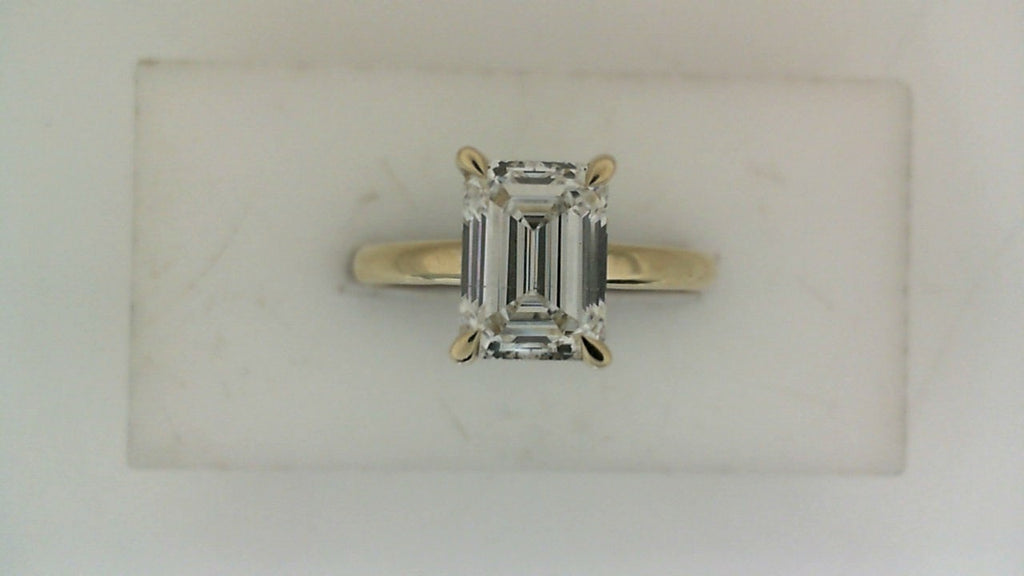 Growing a diamond in a laboratory is still a very complex and costly process. As time goes on and more companies begin to produce these diamonds the price will change due to competition and advancement in technology. For those reasons we are not able to include Lab Grown diamonds in our lifetime upgrade policy. Hidden Accent Lab-Grown Diamond Complete Engagement Ring in 14 Karat Yellow with 1 Emerald Lab Grown Diamond, Color: F, Clarity: VS2, totaling 2.01ctw, and 20 Round Lab Grown Diamonds, totaling: 0.10ctw Ring Size: 7 MM Width: 2.1