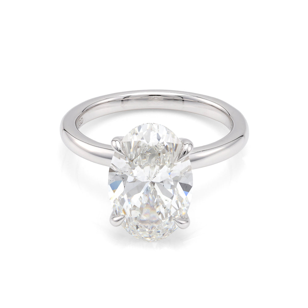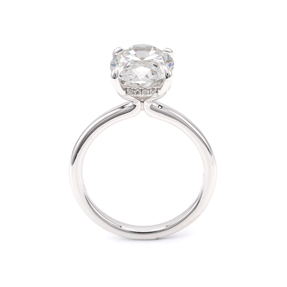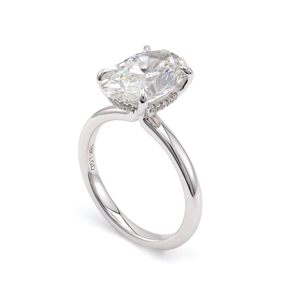 Experience the unparalleled artistry of Marks Jewelers with the ReMARKable Designs Hidden Accent Solitaire Complete Engagement Ring. Crafted in luxurious 18 Karat White Gold, this piece exemplifies our commitment to quality and elegance since 1981. At the heart of this stunning ring lies a breathtaking 1 Oval Lab-Grown Diamond, weighing an impressive 4.42 carats, with a flawless F color and VS1 clarity. Accentuating its brilliance are 18 Round Lab-Grown Diamonds, adding a refined sparkle with a total weight of 0.08 carats.Belonging to our prestigious 'Love Starts Here Collection,' this ring is a perfect symbol for embarking on new journeys or commemorating life's milestones. Designed for sophistication and comfort, it comes in a size 7, tailored for a perfect fit. Lab-grown diamonds, crafted with precision and innovation, offer the same exquisite beauty as natural diamonds, showcasing the future of fine jewelry.Every diamond is meticulously inspected by our team of graduate gemologists, ensuring the highest standards of beauty and authenticity. As part of ReMARKable Designs's esteemed collection, this engagement ring is not just a piece of jewelry, but a testament to love and commitment.Celebrate your special moments with a ring that speaks of timeless elegance and modern craftsmanship. Begin your journey with Marks Jewelers today and let your story unfold with the 'Love Starts Here Collection.' Embrace the brilliance with a purchase that promises immediate delivery. Your love story starts here, where elegance meets innovation.Lab-grown disclaimer. Growing a diamond in a laboratory is still a very complex and costly process. As time goes on and more companies begin to produce these diamonds the price will change due to competition and advancement in technology. For those reasons we are not able to include Lab Grown diamonds in our lifetime upgrade policy.