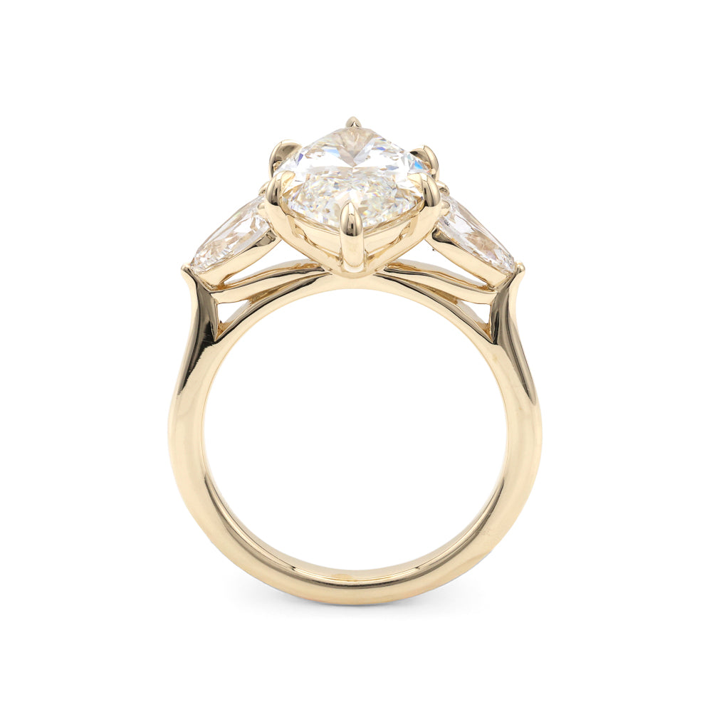 Three Stone Lab-Grown Diamond Complete Engagement Ring in 14 Karat Yellow with 1 Marquise Lab Grown Diamond, Color: F, Clarity: VS1, totaling 4.28ctw, and 2 Pear Lab Grown Diamonds, totaling: 0.66ctw Ring Size: 7 MM Width: 2.1 Growing a diamond in a laboratory is still a very complex and costly process. As time goes on and more companies begin to produce these diamonds the price will change due to competition and advancement in technology. For those reasons we are not able to include Lab Grown diamonds in our lifetime upgrade policy.