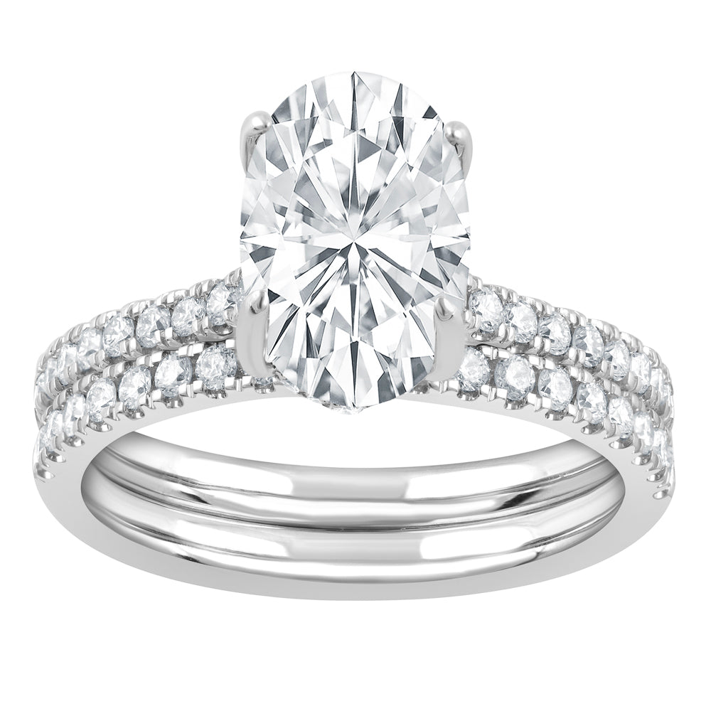 Introducing the exquisite Hidden Accent Side Stone Lab-Grown Diamond Complete Engagement Ring, an embodiment of elegance and modern innovation. Crafted by the esteemed ReMARKable Designs, this captivating piece features a stunning 1 Oval Lab-Grown Diamond that totals 2.14 carats, with a mesmerizing color of F and clarity of VS1, ensuring brilliance and sparkle. Additional 36 round lab-grown diamonds line the band, adding an extra 0.26 carats of luminosity to this remarkable design.Made from high-quality 14 Karat White gold, this engagement ring not only showcases a timeless metal choice but also ensures durability for everyday wear. Specifically sized for ladies at a ring size of 7, it offers a perfect fit while maintaining comfort and style.Lab-grown diamonds are celebrated for their ethical creation process, providing an environmentally conscious choice without compromising on the beauty and allure of traditional diamonds. This ring is a testament to the artistry and precision of expert jewelers, offering a unique blend of sophistication and sustainability.Whether marking a significant life milestone or indulging in a meaningful self-gift, this engagement ring serves as a timeless symbol of love and commitment. It is designed for those who appreciate both elegance and ethical luxury.Discover the allure of lab-grown diamonds and make this stunning engagement ring a part of your story. Visit us today to embrace elegance and innovation in one breathtaking piece.Lab-grown disclaimer. Growing a diamond in a laboratory is still a very complex and costly process. As time goes on and more companies begin to produce these diamonds the price will change due to competition and advancement in technology. For those reasons we are not able to include Lab Grown diamonds in our lifetime upgrade policy.