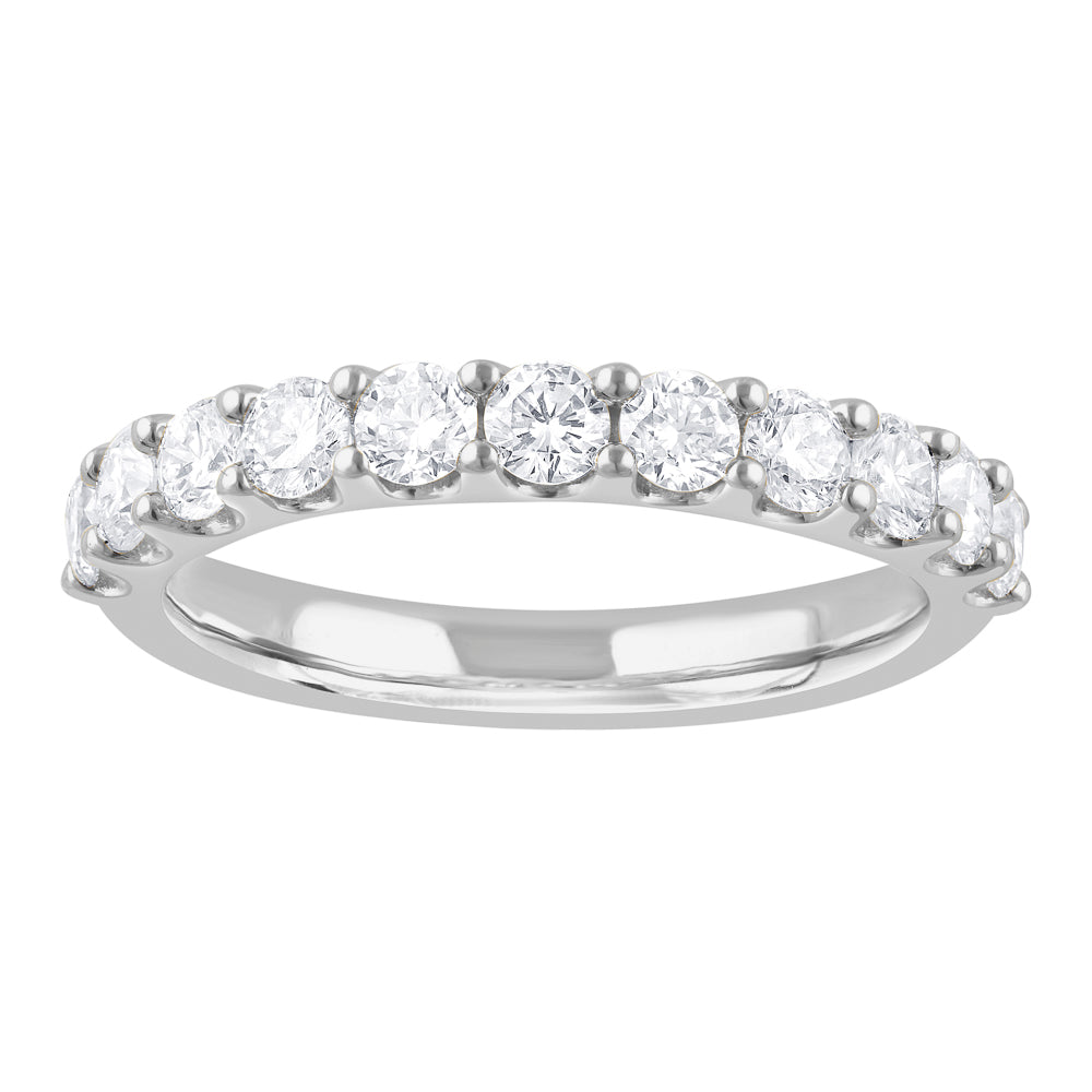 Celebrate your special moments with this exquisite Lab-Grown Diamond Ladies Wedding Band, meticulously crafted in lustrous 14 Karat White gold. This elegant piece features 11 shimmering round lab-grown diamonds, collectively weighing 0.75 carats, offering the brilliance and sophistication that every bride desires. Designed specifically for women, this ring is a timeless symbol of love and commitment, ideal for those who appreciate both beauty and sustainability.With a comfortable ring size of 7 and a sleek 2.9mm width, this band is perfect for everyday wear while still making a bold statement. The use of lab-grown diamonds ensures that you enjoy the same sparkle and prestige as natural diamonds, with the added benefit of being environmentally friendly and ethically sourced.Each diamond is selected for its exceptional quality, promising to catch the light beautifully at every angle. Although no specific clarity is provided, rest assured that these stones are chosen for their superior appearance by expert gemologists.Whether you're marking an engagement, wedding, or a personal milestone, this ring is a meaningful gift that will be cherished forever. Embrace the elegance and innovation of lab-grown diamonds with this stunning piece. Add it to your collection today and let it symbolize your enduring love and commitment.Make your purchase now and experience the unparalleled beauty of lab-grown diamonds with this sophisticated wedding band. Perfect for those who value both tradition and modernity.Lab-grown disclaimer. Growing a diamond in a laboratory is still a very complex and costly process. As time goes on and more companies begin to produce these diamonds the price will change due to competition and advancement in technology. For those reasons we are not able to include Lab Grown diamonds in our lifetime upgrade policy.
