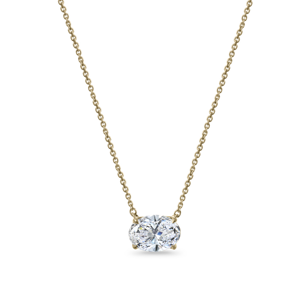 Lab-Grown Diamond Necklace in 18 Karat Yellow with 1 Oval Lab Grown Diamond, Color: D, Clarity: VS2, totaling 1.09ctw Chain Type: Diamond Cut Cable Chain Length: 18 Clasp Type: Lobster Claw