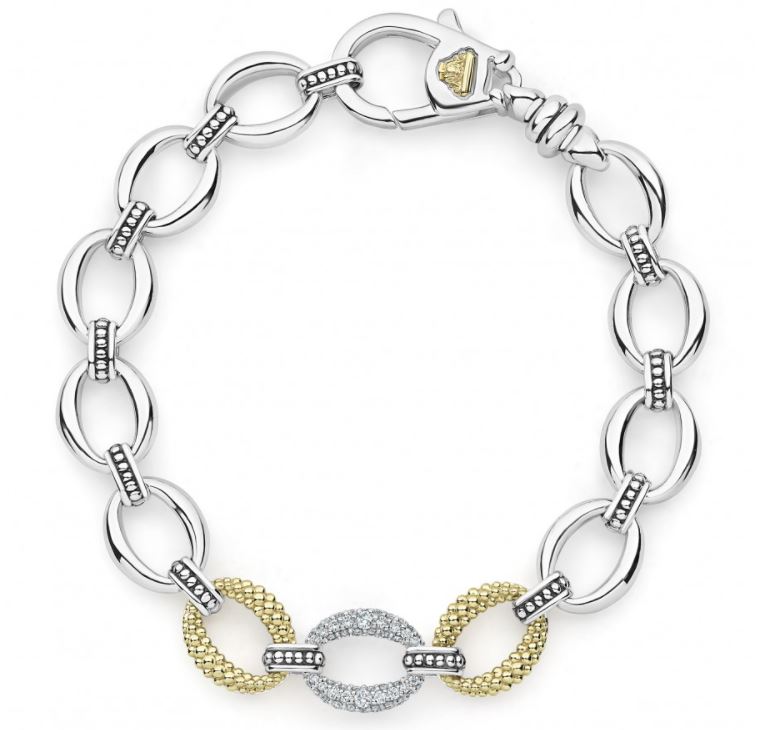 The bracelet is a harmonious blend of sterling silver and 18 karat white-yellow gold, presenting a striking two-tone effect that adds an opulent touch to any outfit. Its oval link pattern not only highlights timeless style but also ensures durability, making it a cherished accessory for years to come. Designed with the discerning woman in mind, the secure lobster claw clasp guarantees a perfect fit.