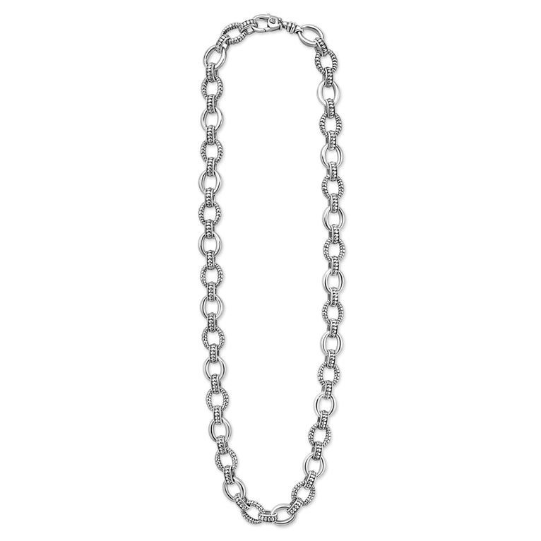 Discover the elegance of the LAGOS Signature Caviar Collection Necklace, a stunning piece that exemplifies timeless style and sophistication. Crafted from premium sterling silver, this necklace features a striking oval link chain that perfectly complements the white metal color. Measuring 18 inches in length, it is designed to drape gracefully around the neck, while the lobster claw clasp ensures a secure and comfortable fit. This exquisite necklace, free of stones, embodies the essence of minimalist beauty and versatility.