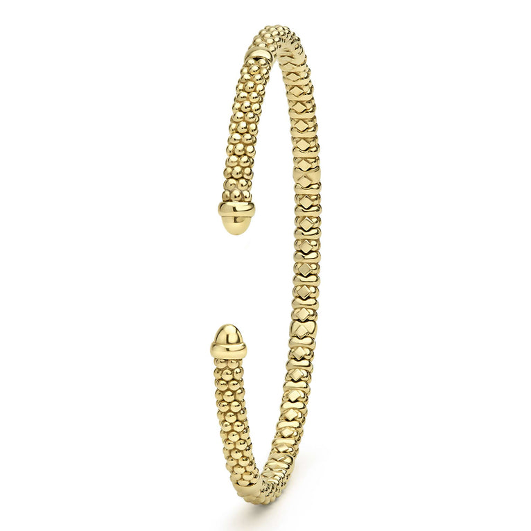 Discover the elegance of the LAGOS Signature Caviar Collection Bracelet, a stunning piece crafted from 18 Karat Yellow Gold. This cuff bracelet, designed specifically for ladies, measures 7 inches in length and is free from any clasps, offering a seamless and sophisticated look. The absence of stones highlights the pure beauty of its high-ReMARKable Designs, making it a timeless accessory for any occasion.