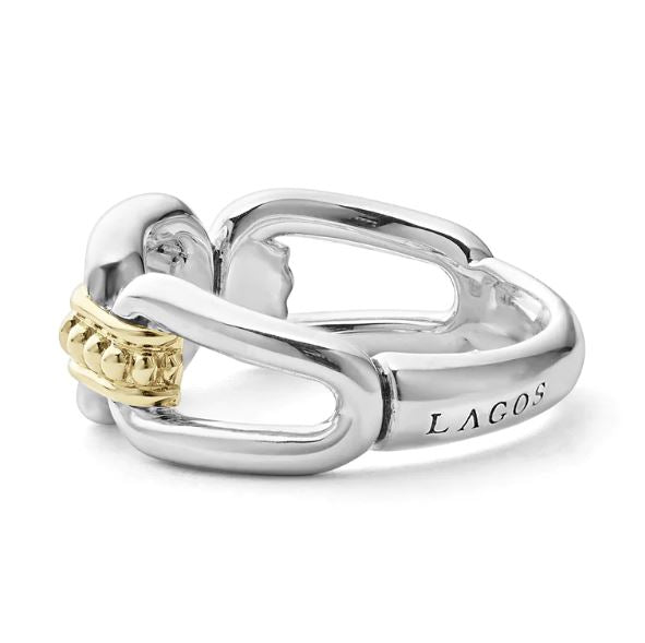 Discover the unparalleled allure of the LAGOS Signature Caviar Collection Fashion Ring, a true testament to timeless elegance and exceptional craftsmanship. This exquisite fashion ring, designed by the esteemed brand LAGOS, showcases a masterful blend of Sterling Silver and 18 Karat Gold. The cool brilliance of the white metal perfectly complements the warm glow of yellow gold, creating a stunning visual harmony. Measuring a bold 9mm in width and available in size 7, this ring is designed to make a statement while providing comfort for both everyday wear and special occasions.