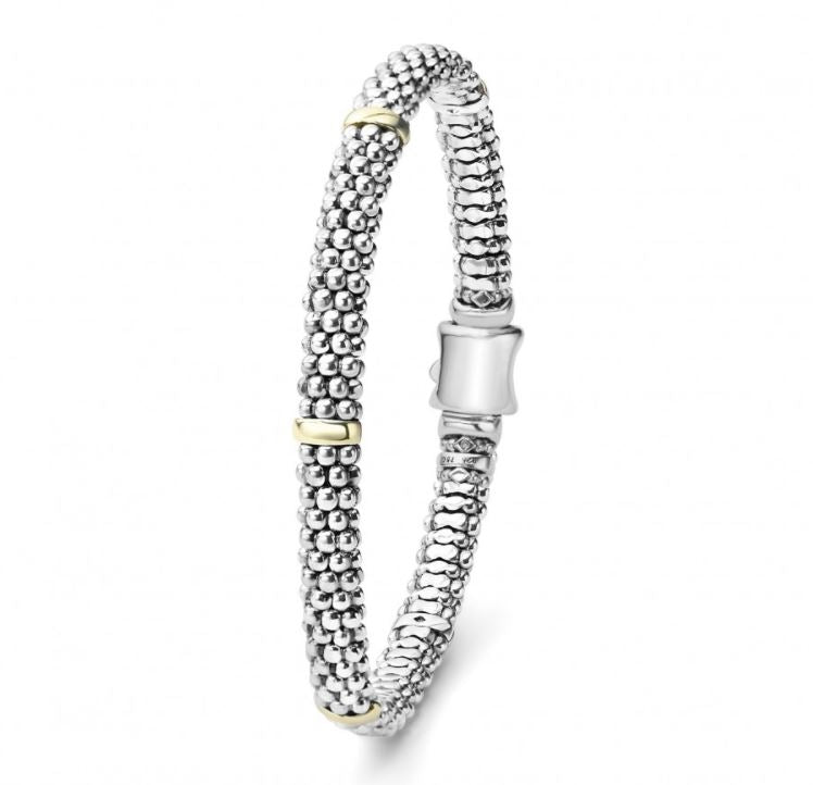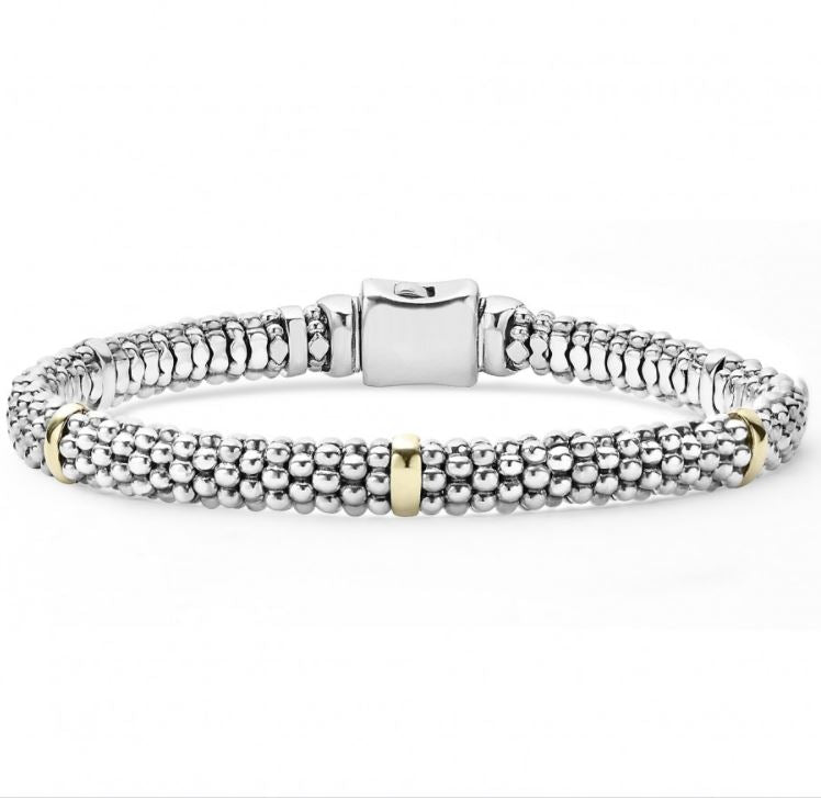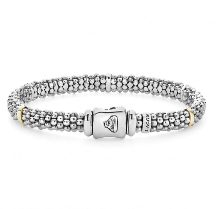 Discover the timeless allure of the LAGOS Signature Caviar Collection Station Bracelet, a distinguished piece of fine jewelry that embodies luxury and sophistication. This exquisite bracelet, crafted by the renowned brand LAGOS, features a harmonious blend of luxurious sterling silver and 18-karat white and yellow gold. The absence of stones accentuates the bracelet's signature caviar beading, showcasing the unparalleled craftsmanship and meticulous attention to detail that LAGOS is celebrated for. Measuring 7 inches, it gracefully adorns a lady's wrist, offering both comfort and elegance with its secure hidden plunger clasp. Perfect for commemorating personal milestones or gifting to a cherished loved one, this bracelet is a testament to enduring quality and style. Priced at $850.00, it is a worthwhile investment in elegance and sophistication. Elevate your jewelry collection with this remarkable piece and experience the unmatched artistry of LAGOS. Indulge in luxury and sophistication-shop now to enrich your collection.