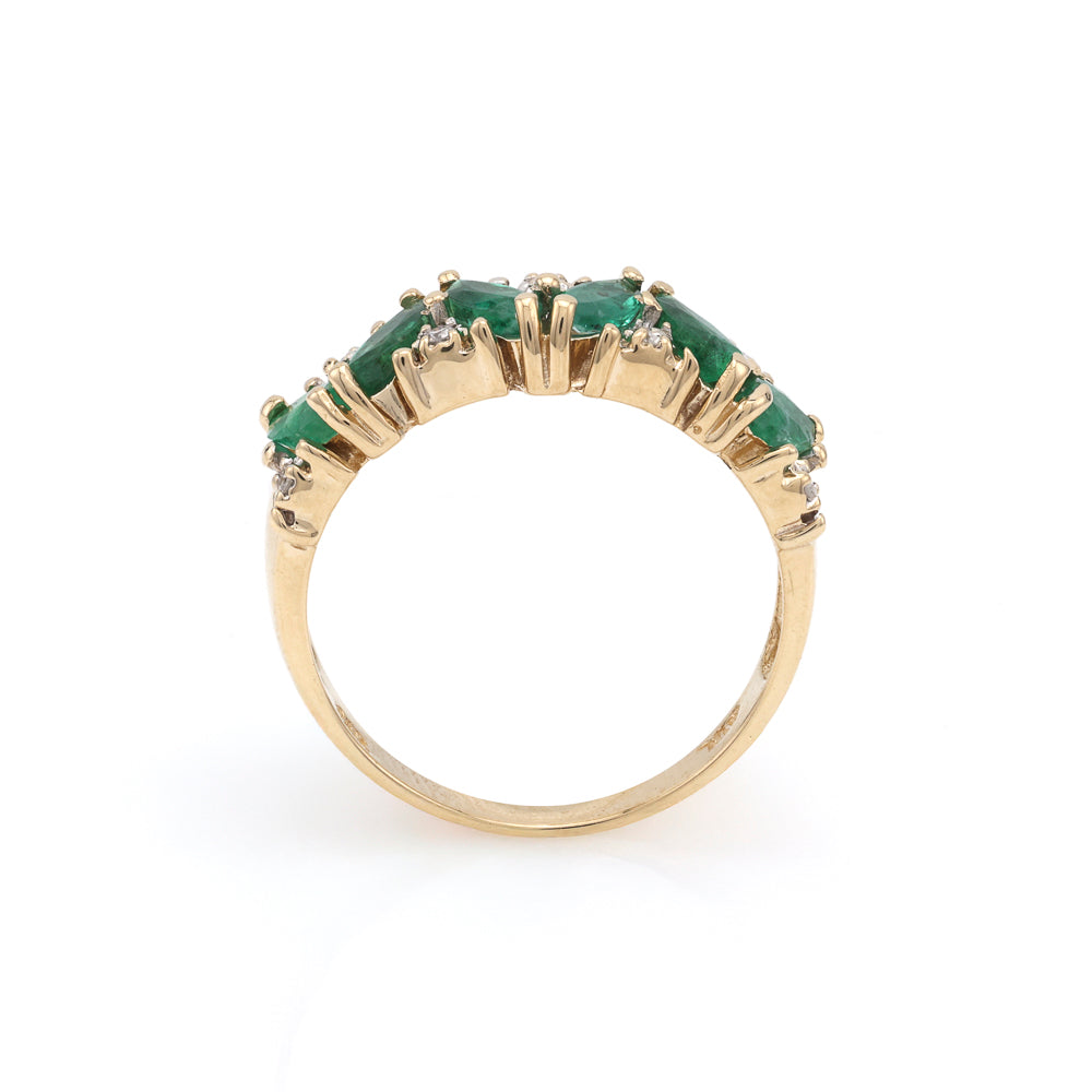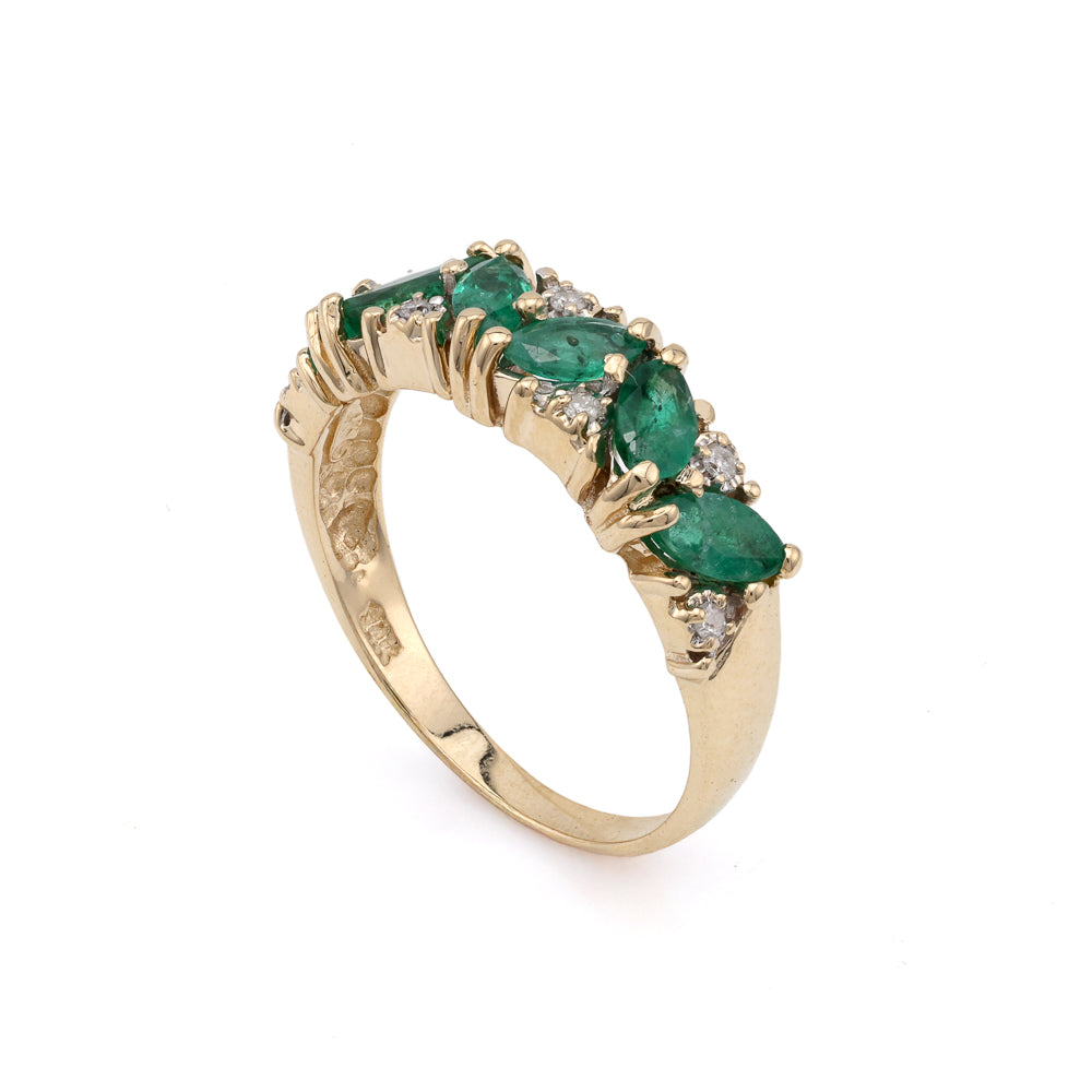 Experience the timeless elegance of the Marks Estate Dept 1 Color Gemstone Band, a luxurious accessory that embodies sophistication and charm. Crafted in 14 Karat Yellow Gold, this band radiates a warm glow that perfectly complements its opulent design. At its core are six exquisite marquise-cut emeralds, totaling 0.90 carats, each chosen for their vibrant natural beauty. Adding to its allure, seven round diamonds with a total weight of 0.07 carats provide a captivating sparkle. These diamonds, with a color grade of I/J and clarity of I1, enhance the band's overall brilliance and appeal. Expertly refurbished, this estate ring is available in a comfortable size 7 and features a 4mm width, offering a seamless blend of elegance and wearability. Originally priced at $1,995, this remarkable piece is now available for $1,197, offering exceptional value. Whether commemorating a personal achievement or selecting a heartfelt gift, this gemstone band connects you to the rich heritage of estate jewelry. Don't miss the opportunity to make this exquisite band a cherished addition to your collection. Visit our store or explore online to witness the beauty and craftsmanship of this elegant piece firsthand, and let it become a treasured companion for a lifetime.