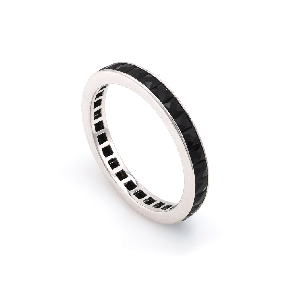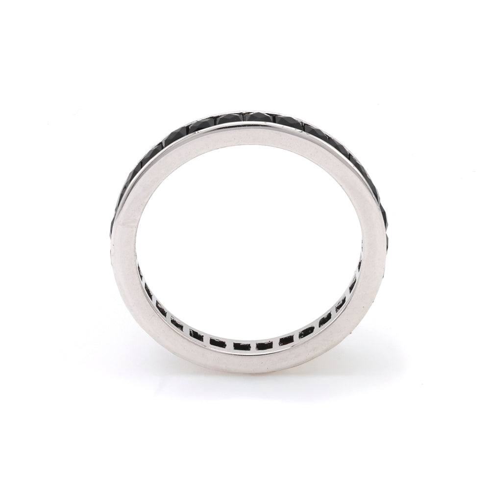 Discover the timeless elegance of the Marks Estate Dept 1 Color Gemstone Band, a remarkable piece that embodies sophistication and style. Crafted from the luminous sheen of Platinum White, this exquisite band features 29 unique black obsidian stones, each artfully set to create a striking contrast against the platinum. With a comfortable size 6 fit and a sleek width of 2.68mm, it offers a perfect harmony of classic refinement and modern flair.