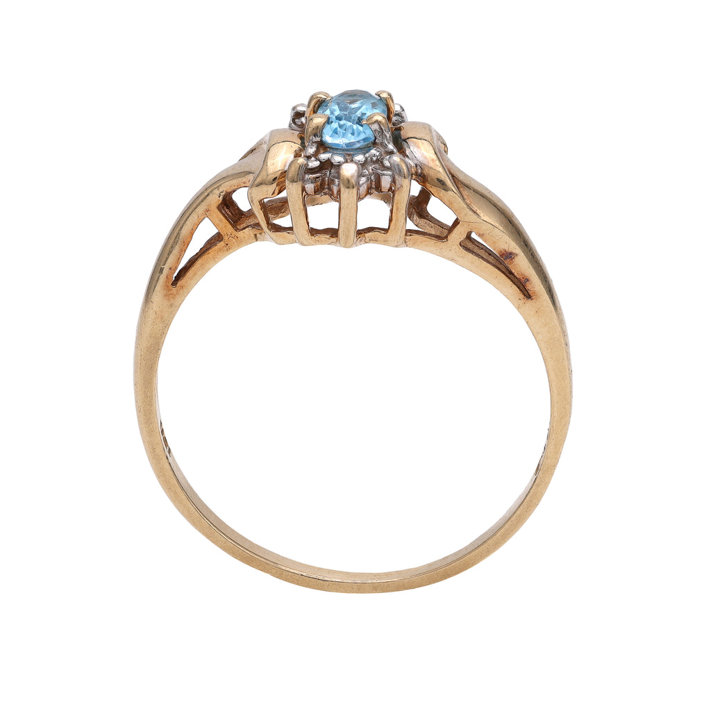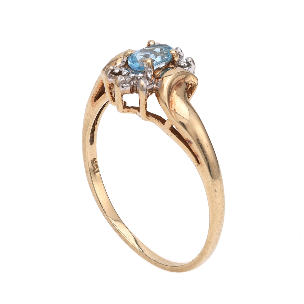 Embrace the timeless sophistication of the ReMARKable Estate Collection, a unique offering from Marks Jewelers. This exquisite ladies' color gemstone ring, part of our esteemed estate collection, showcases the harmonious blend of history and artistry. Set in gleaming 10 Karat Yellow Gold, the ring features a mesmerizing oval blue topaz weighing 0.22 carats, exuding a tranquil azure glow that captivates the beholder. Complementing the topaz are two natural round diamonds, totaling 0.01 carats, which add a subtle brilliance to this elegant piece. Our dedicated master jewelers have skillfully refurbished this estate treasure, ensuring it maintains its original allure while aligning with modern standards. The ring is a size 7 and boasts a refined width of 8.91mm, making it a perfect fit for those who cherish unique, storied jewelry. Whether marking a personal achievement or expressing your distinct style, this gemstone ring offers more than just beauty-it symbolizes cherished moments and enduring elegance. At Marks Jewelers, we uphold a commitment to excellence, with our graduate gemologists ensuring each piece meets the highest quality standards. Let this estate ring become a prized addition to your collection, celebrating your life's milestones. Indulge in its allure, and seize the opportunity to own a piece that tells a story. Discover the elegance of the ReMARKable Estate Collection today.This item is an estate piece of jewelry, often one-of-a-kind, and has been previously owned. It has been refurbished by our master jewelers to be enjoyed again.