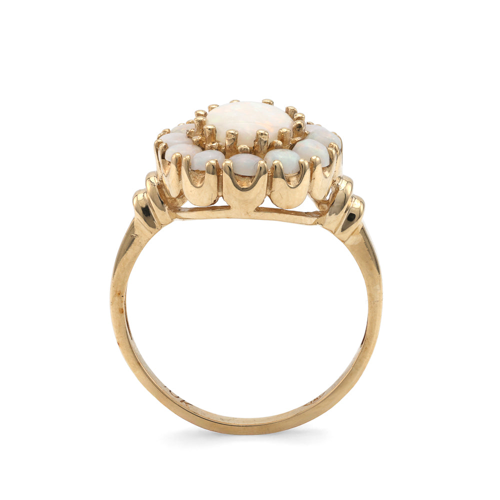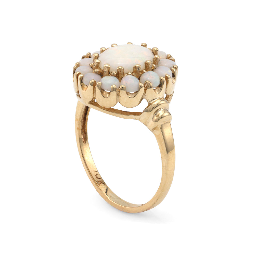 Color Gemstone Ring in 10 Karat Yellow with 1 Oval Opal and 12 Round Opals Ring Size: 5.5 MM Width: 1.9 Collection: M Estate "This item is an estate piece of jewelry, often one-of-a-kind, and has been previously owned. It has been refurbished by our master jewelers to be enjoyed again."