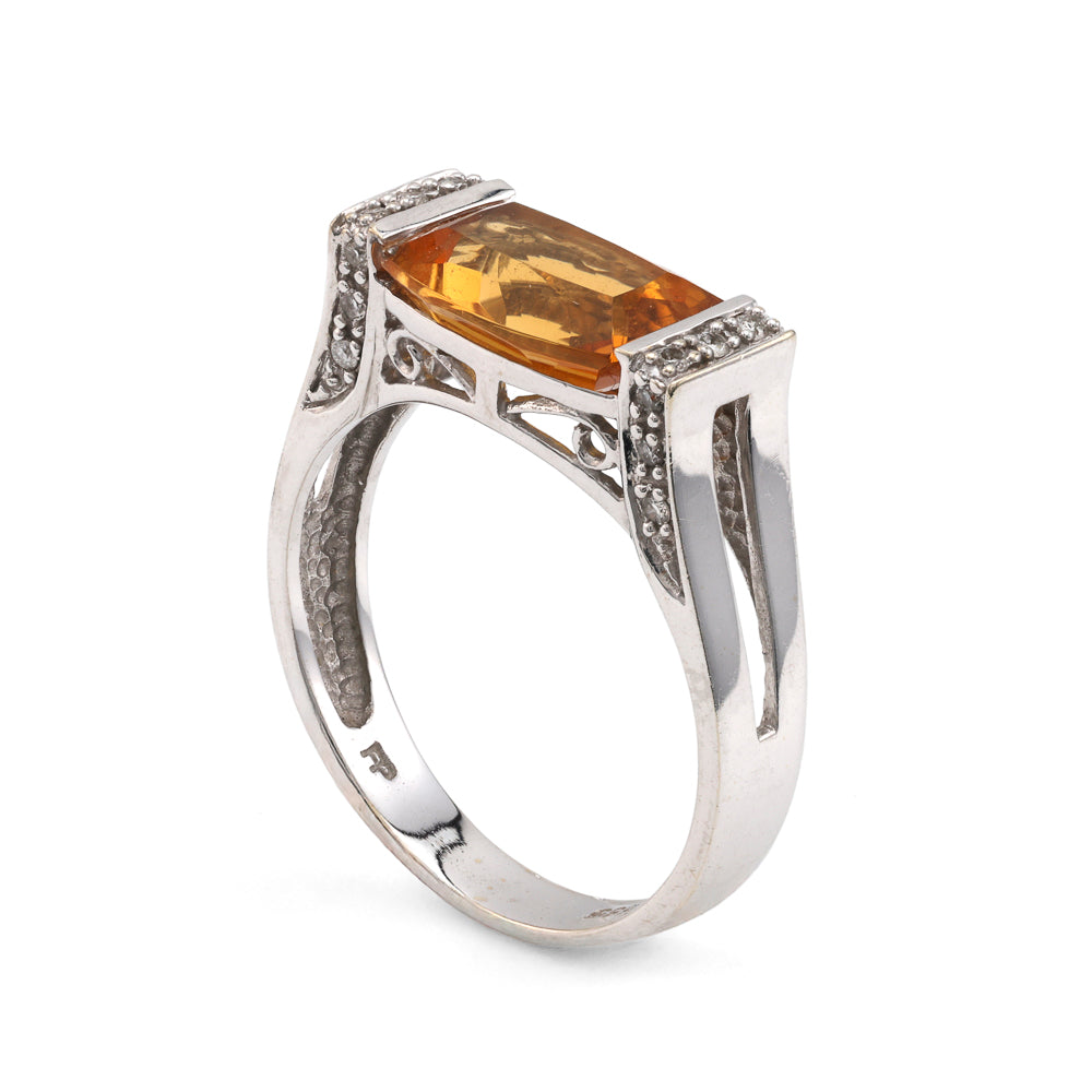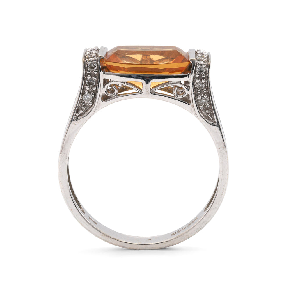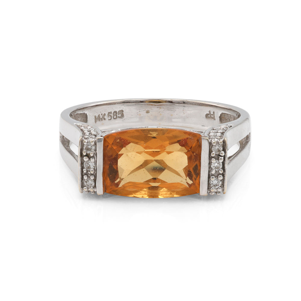 Color Gemstone Ring in 14 Karat White with 1 Cushion Citrine, totaling 2.22ctw and 18 Round Diamonds, Color: I/J, Clarity: SI2-I1, totaling 0.20ctw Ring Size: 7 MM Width: 4.7 Collection: M Estate "This item is an estate piece of jewelry, often one-of-a-kind, and has been previously owned. It has been refurbished by our master jewelers to be enjoyed again."