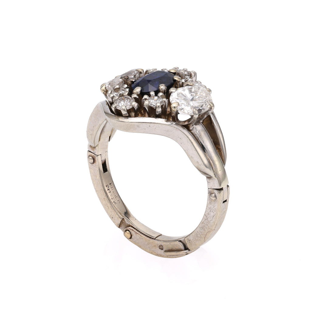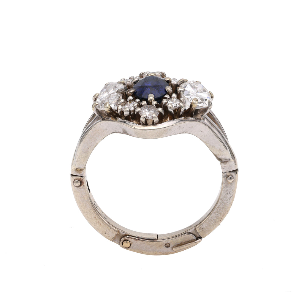Experience the captivating elegance of the ReMARKable Estate M Collection with this Color Gemstone Ring, designed for those who appreciate fine jewelry. This enchanting piece showcases an oval violetish blue sapphire, weighing 0.70 carats, set in the refined backdrop of 14 Karat white gold. Its rich hue is accentuated by two exquisite old European diamonds, with a color grading of G/H and clarity ranging from I1-I2, totaling 0.91 carats. To further enhance its allure, six round diamonds are delicately arranged, boasting a color grading of H/I and clarity of SI2-I1, collectively totaling 0.30 carats.Renowned for its superior craftsmanship, this estate ring is a testament to the artistry and precision of skilled jewelers, ensuring it is ready to be cherished once more. With a ring size of 5.25 and a 2.5mm width, it offers a perfect fit for ladies who seek elegance in every detail. Our experienced graduate gemologists meticulously select the natural diamonds, guaranteeing their authenticity and top-notch quality.Embrace the history and uniqueness of estate jewelry with this one-of-a-kind piece, a true reflection of personal milestones and enduring sophistication. Perfect as a self-gift or for a cherished loved one, this ring symbolizes timeless elegance. Rediscover the joy of owning estate jewelry and celebrate your unique journey with this remarkable piece. Add this exquisite ring to your collection and let it tell your story. Don't miss the opportunity to own a piece of history-order now and make it yours today.This item is an estate piece of jewelry, often one-of-a-kind, and has been previously owned. It has been refurbished by our master jewelers to be enjoyed again.
