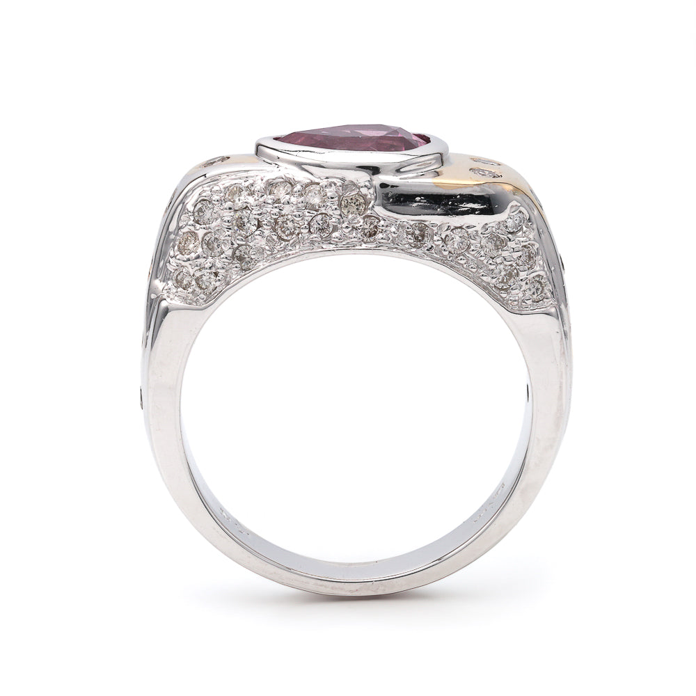Unveil the captivating elegance of the Color Gemstone Ring from the M Estate Collection by Marks Jewelers. This exquisite piece showcases a breathtaking 2.66 carat pear-shaped pink sapphire nestled in luxurious 14 Karat white and yellow gold. The vibrant sapphire is artfully accented by 51 round natural diamonds, boasting a total weight of 0.50 carats, selected for their outstanding G color and VS2 clarity, ensuring an unrivaled brilliance.Designed specifically for ladies, this remarkable ring is available in a ring size of 8.5 and features a substantial width of 9.02mm, making it a bold statement for any occasion. It serves as a perfect symbol of personal milestones or as a cherished self-gift, representing your unique journey and achievements.Expertly refurbished by graduate gemologists, this estate treasure is restored to its original glory, ready to be passed down through generations. Each element of this ring reflects the legacy of Marks Jewelers' dedication to quality and craftsmanship, where every piece tells a story of passion and enduring beauty.Embrace the timeless allure of heirloom-quality jewelry with this stunning gemstone ring. Experience the exceptional artistry and elegance that defines the M Estate Collection. Make it yours today and celebrate the finer things in life.This item is an estate piece of jewelry, often one-of-a-kind, and has been previously owned. It has been refurbished by our master jewelers to be enjoyed again.