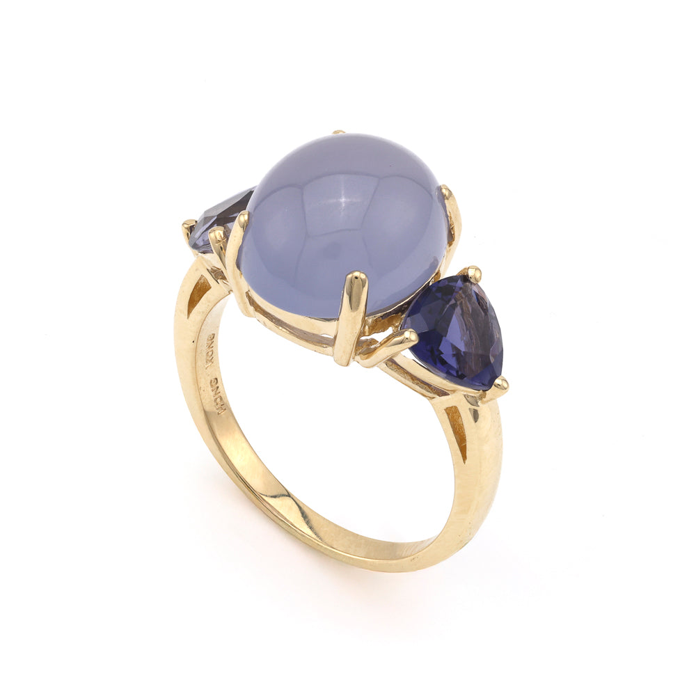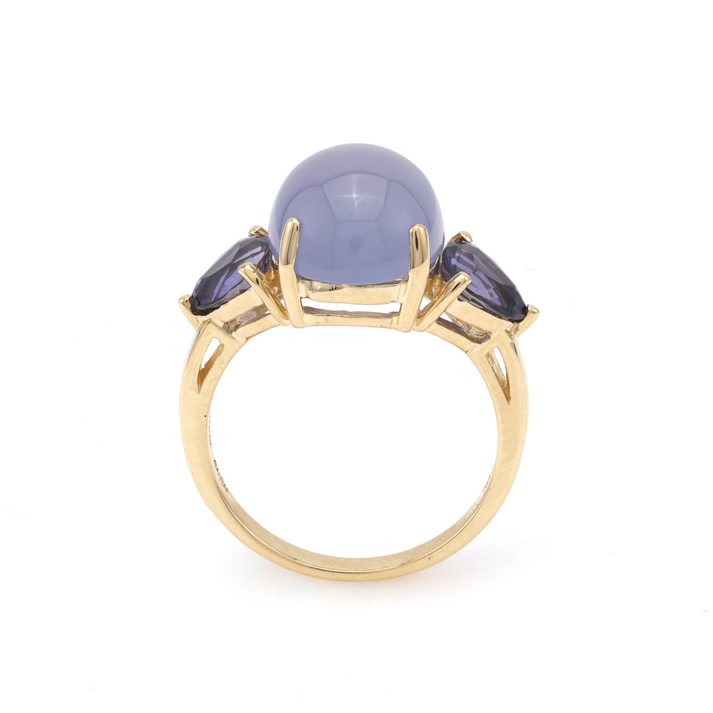 Discover the timeless elegance of the Color Gemstone Ring from Marks Estate Dept 1, a true testament to refined craftsmanship and sophistication. This exquisite piece is meticulously designed in 14 Karat Yellow Gold, featuring a captivating 4.88-carat cabochon Lavender Quartz, elegantly cut to a perfect 12mm diameter. Its soft, enchanting hue serves as the centerpiece, exuding a gentle allure perfect for any occasion. Complementing this remarkable gem are two trillion-cut Tanzanites, together weighing 1.35 carats, which add a vibrant touch of color and elegance. The sleek 2.4mm band ensures a comfortable fit at size 6.25, ideal for those who appreciate understated luxury. Each gemstone has been thoroughly evaluated by graduate gemologists, guaranteeing their authenticity and brilliance. Thoughtfully refurbished to maintain its original splendor, this estate piece embodies the enduring beauty and exceptional craftsmanship synonymous with Marks Estate Dept 1. Whether marking a personal milestone or indulging in a meaningful self-gift, this ring transcends mere adornment; it celebrates your unique journey. Priced at $1017.00, with a compare-at price of $1695.00, seize the opportunity to enhance your collection with this extraordinary piece. Experience unmatched allure and embrace luxury-make this magnificent ring yours today.