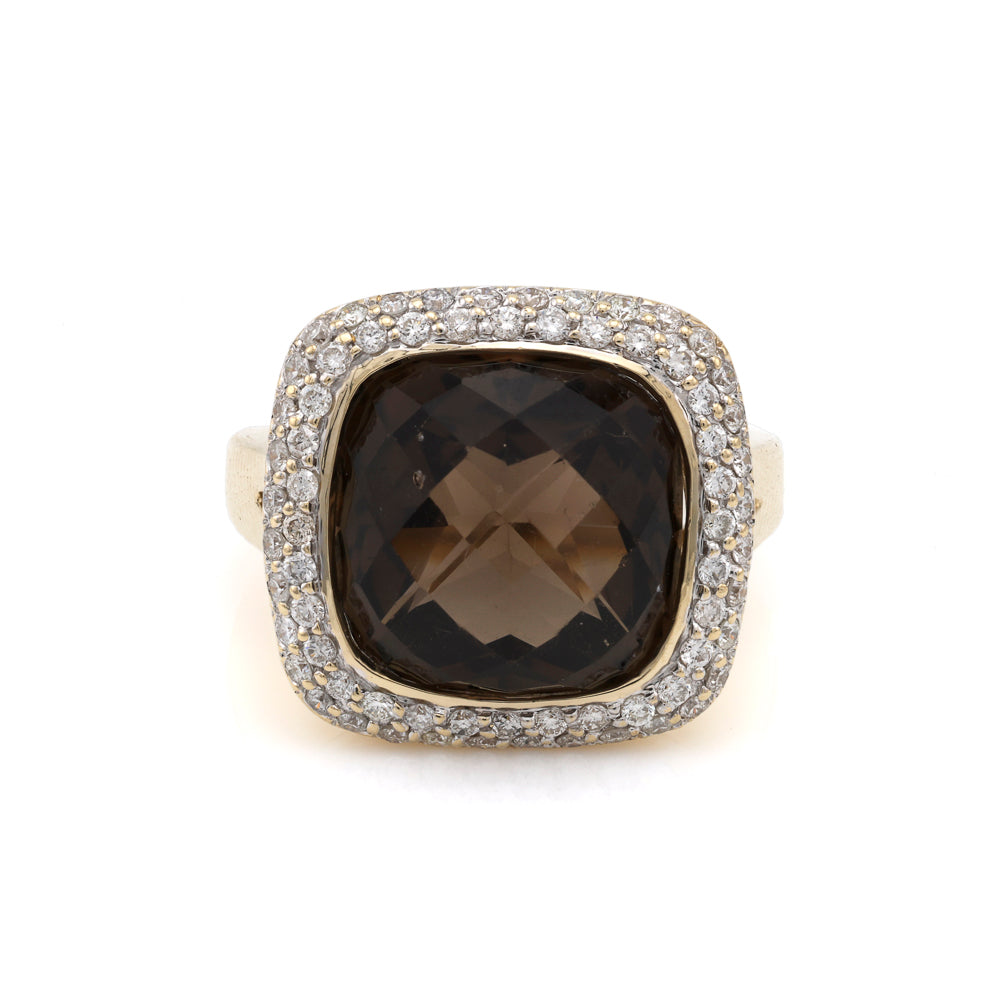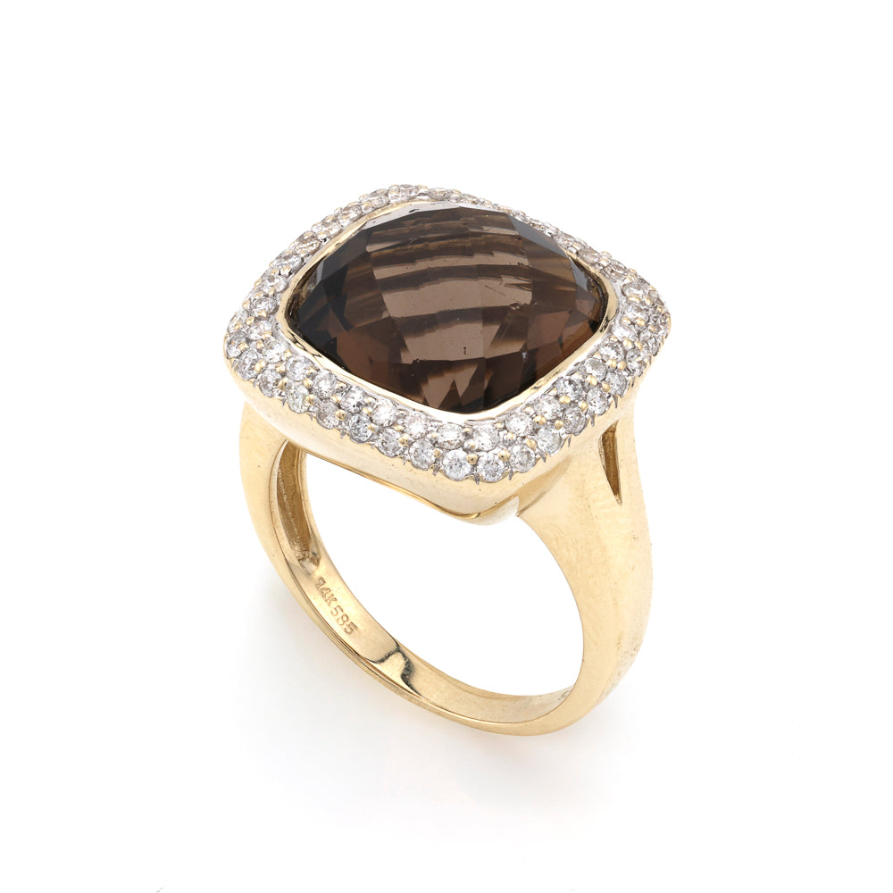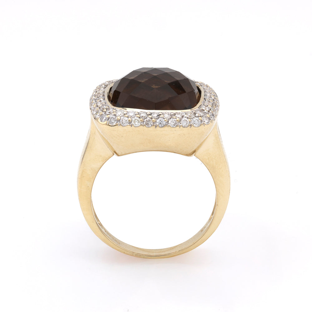 Color Gemstone Ring in 14 Karat Yellow with 1 Cushion Smokey Quartz, totaling 9.38ctw and 68 Round Diamonds, Color: H/I, Clarity: SI1-SI2, totaling 0.51ctw Ring Size: 6.75 MM Width: 4.16 Collection: M Estate "This item is an estate piece of jewelry, often one-of-a-kind, and has been previously owned. It has been refurbished by our master jewelers to be enjoyed again."
