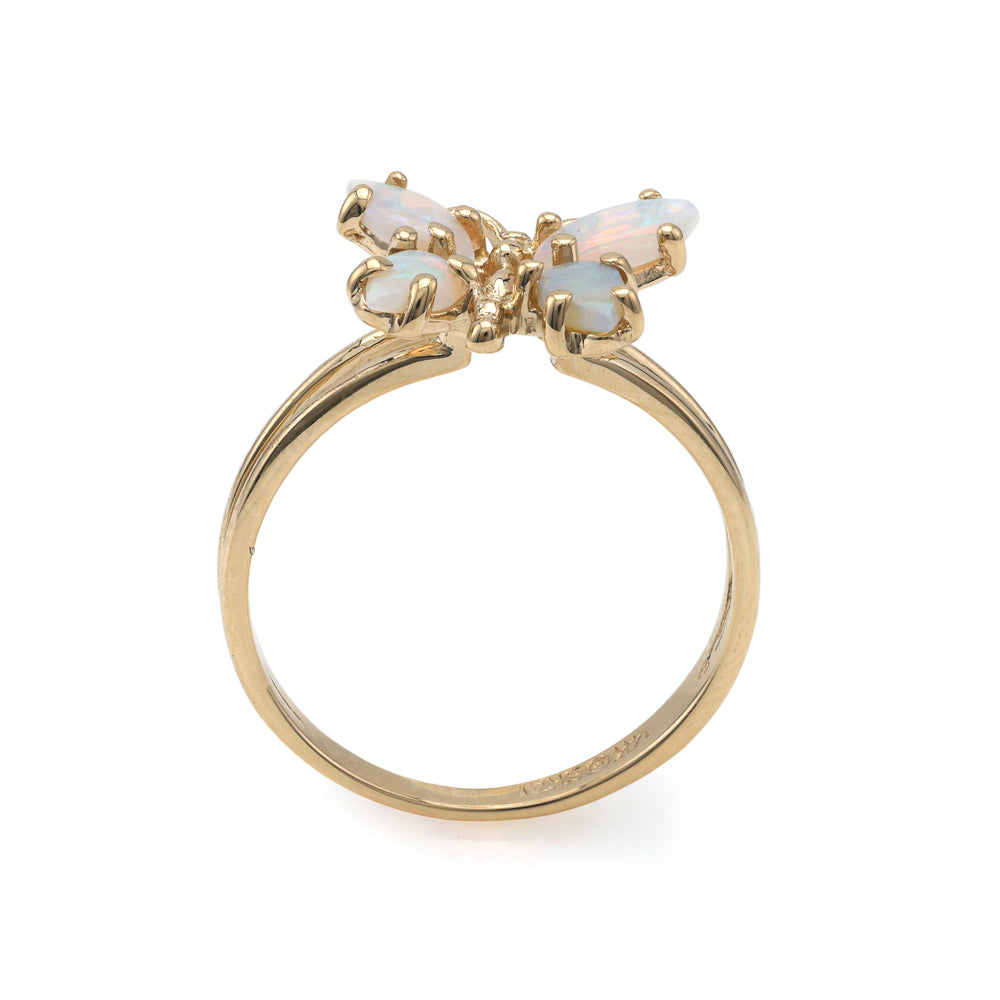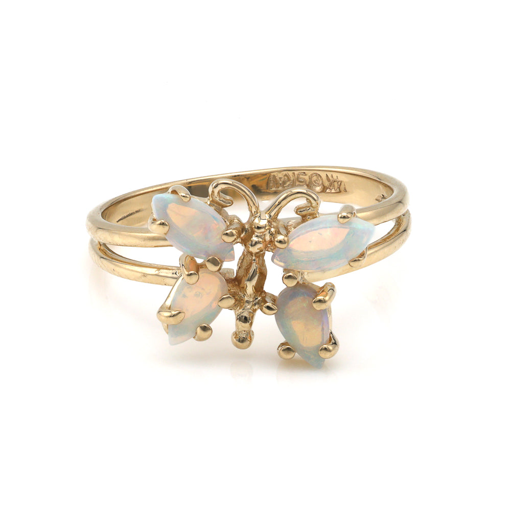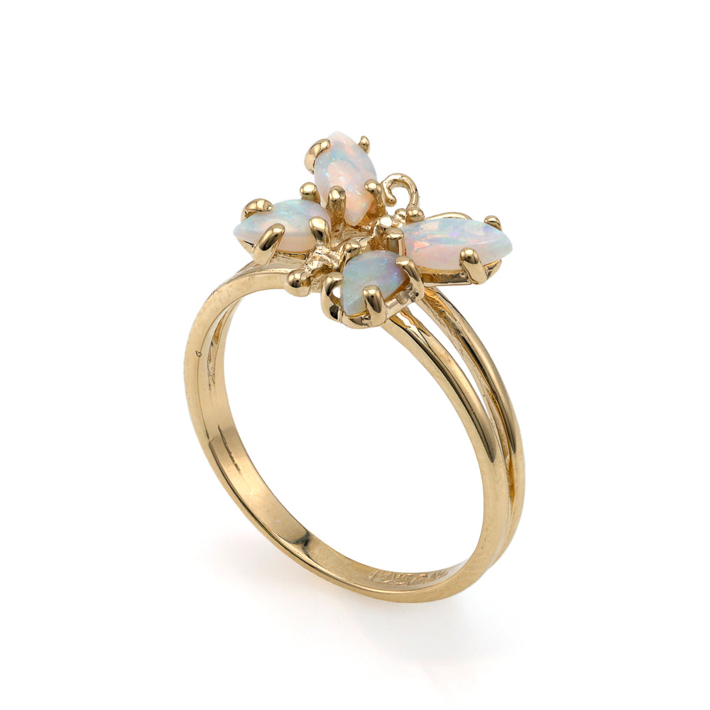Experience the timeless elegance and captivating allure of the Marks Estate Dept 1 Color Gemstone Ring. This exquisite piece embodies impeccable craftsmanship, showcasing two marquise and two pear-shaped opals, each artfully set in lustrous 14 karat yellow gold. The stunning opals exhibit a vibrant play of colors, creating a mesmerizing effect that adds a touch of magic and individuality to any style. This estate piece has been lovingly restored by skilled jewelers, preserving its captivating charm and quality, making it a truly unique addition to any collection. Designed in a comfortable size 6.5 with a sleek 2.6mm width, this ring combines sophistication with everyday wearability. Whether you're celebrating a personal milestone or indulging in a meaningful self-gift, this gemstone ring offers a story of elegance and grace. Priced at $597.00, with a compare-at price of $995.00, it delivers incredible value. Embrace the opportunity to own a piece imbued with history and character, symbolizing your unique journey and style. Visit us today to explore more exclusive pieces that resonate with your soul.