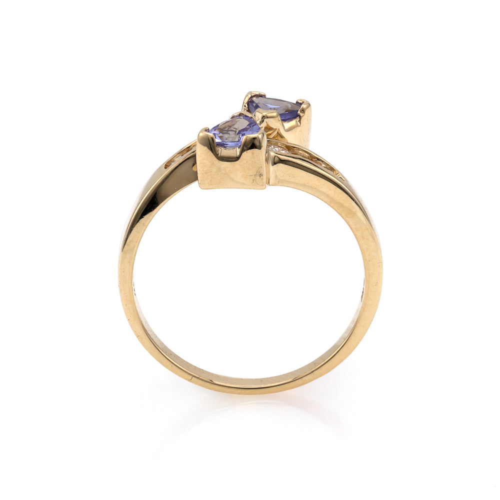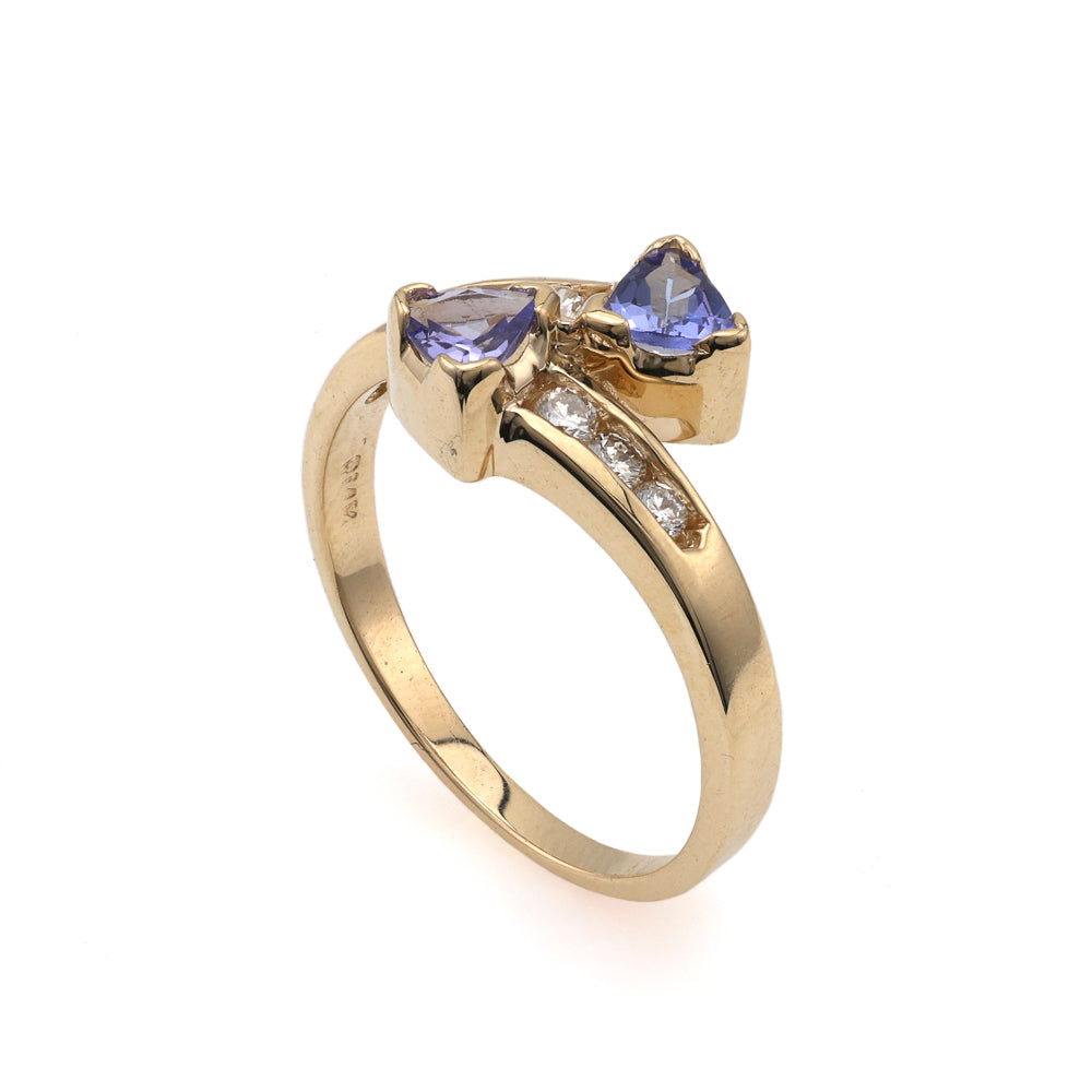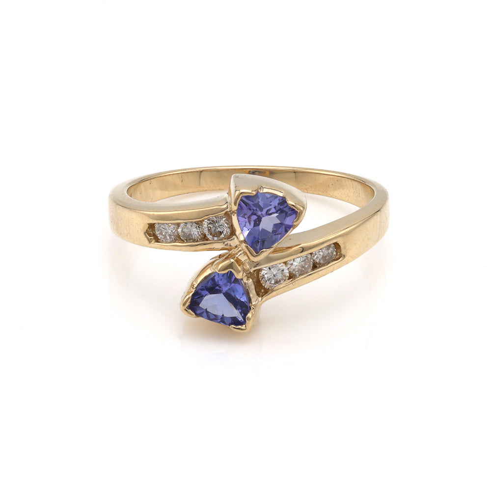 Discover the exquisite artistry of the Marks Estate Department 2 Color Gemstone Ring, a perfect fusion of timeless beauty and historical elegance. This stunning piece features two mesmerizing trillian-cut bluish violet tanzanites, with a total weight of 0.53 carats, set in luxurious 14 Karat Yellow Gold. The vibrant hues of the tanzanites are gracefully enhanced by six round natural diamonds, offering a combined weight of 0.16 carats, with a J/K color grade and I1-I2 clarity. Sized at a comfortable 7 and with a sleek width of 2.99mm, this ring exudes sophistication and style, making it an ideal accessory for any occasion.