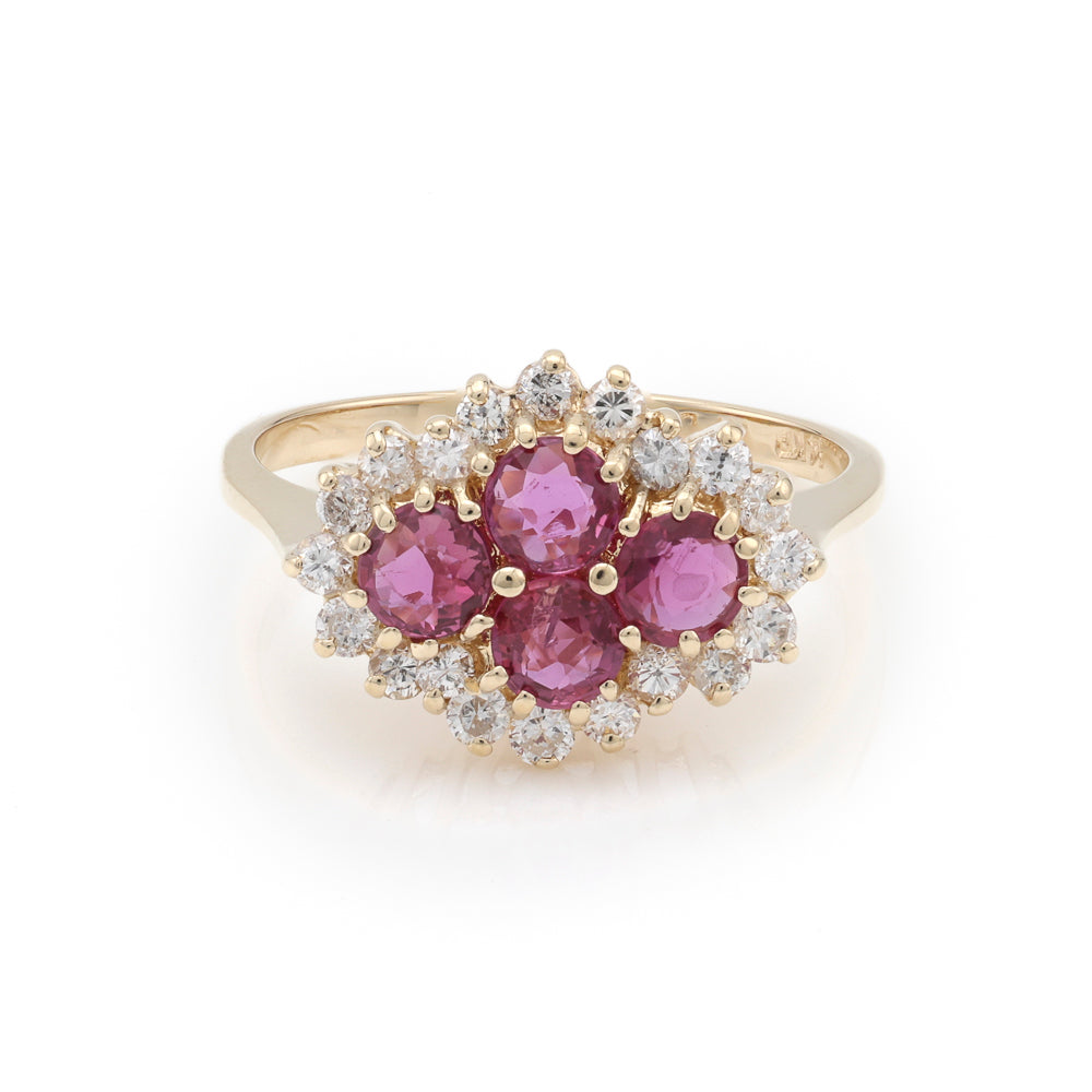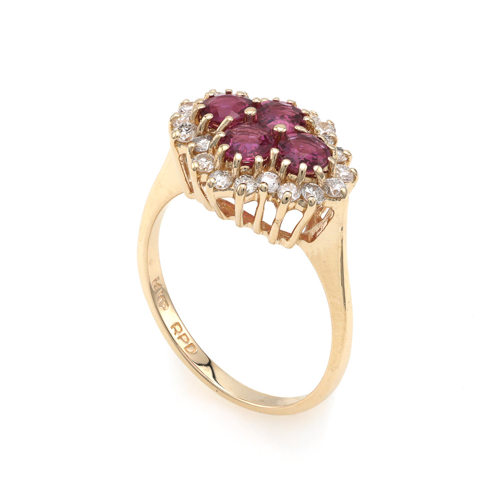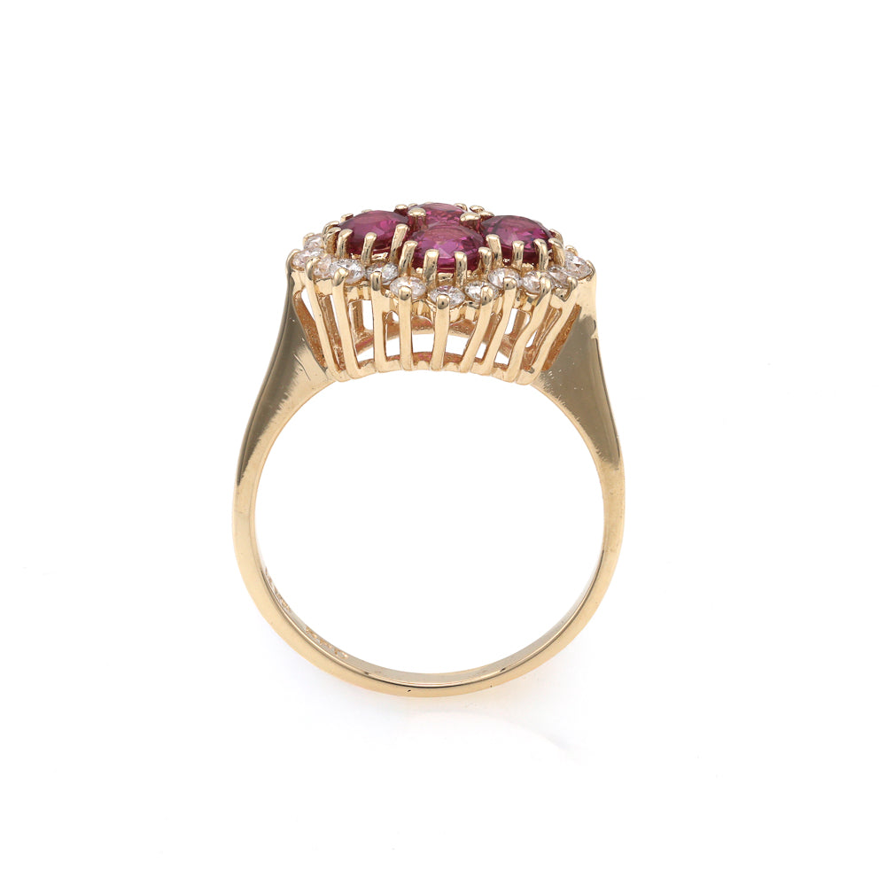 Introducing the captivating Color Gemstone Ring from Marks Estate Department 2, a unique piece that blends timeless elegance with refined craftsmanship. This exquisite ring is crafted in 14 Karat Yellow Gold, offering a warm and inviting glow that perfectly complements its precious stones. At its heart, four vibrant round rubies, totaling 0.64 carats, stand as symbols of passion and vitality. These stunning rubies are elegantly accompanied by 20 brilliant round diamonds, with a total weight of 0.44 carats. Graded H/I in color and SI2-I1 in clarity, these natural diamonds create a breathtaking display of light and sparkle, enhancing the ring's sophisticated allure.