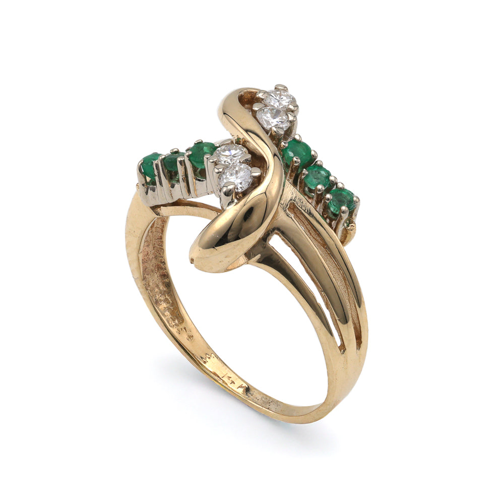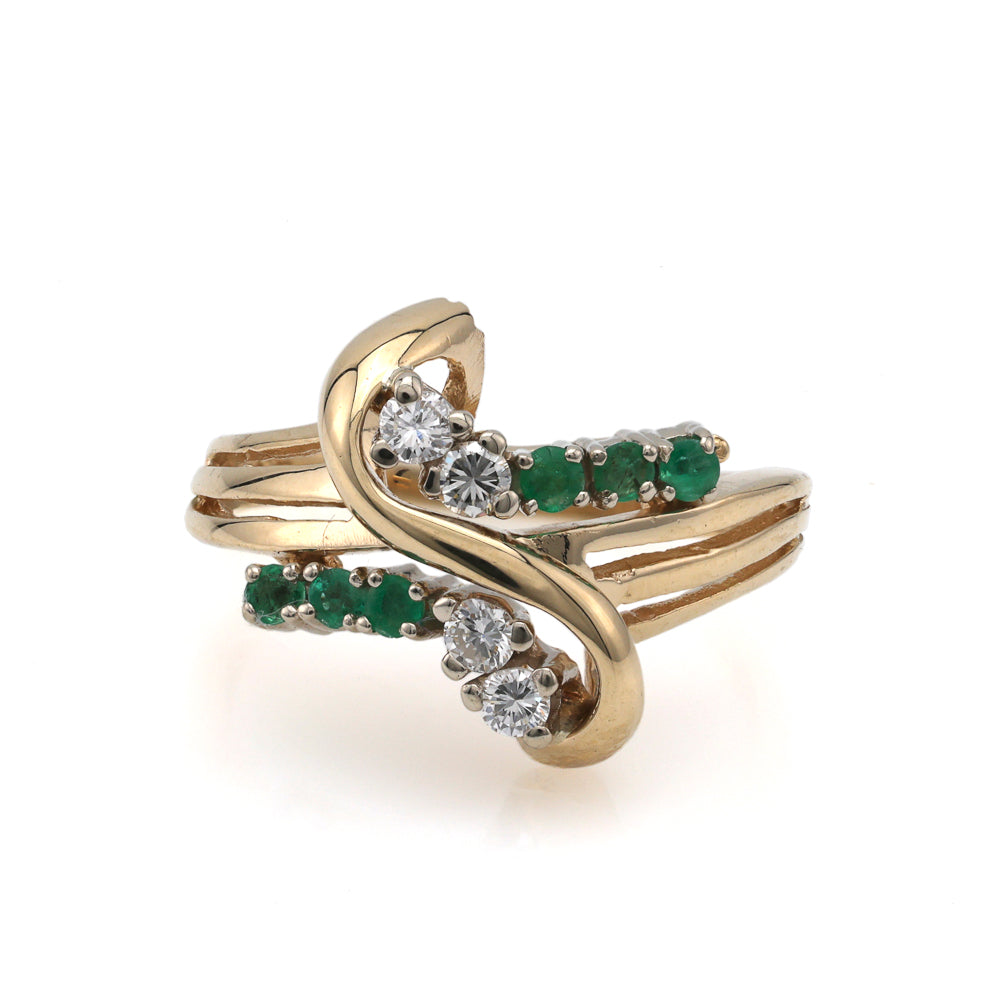 Experience the enchanting beauty of the Marks Estate Dept 1 Color Gemstone Ring, a stunning blend of sophistication and history. This exquisite piece showcases six vivid round green emeralds totaling 0.12 carats, perfectly complemented by four dazzling round diamonds with a total weight of 0.20 carats. Each gemstone is expertly set in lustrous 14 Karat Yellow Gold, offering a striking contrast that draws the eye and captures the heart. With a delicate size of 4.75 and a comfortable 3mm band width, this ring is as versatile as it is elegant, ideal for both everyday wear and special occasions. Priced at $995.00, this unique heirloom is a timeless addition to any collection. Embrace the elegance and heritage of this extraordinary ring, a symbol of your unique journey and personal milestones. Visit us to experience the allure of the Marks Estate Dept 1 collection and secure this captivating piece for yourself or a loved one. Don't miss the opportunity to own a piece of history that will inspire for generations.