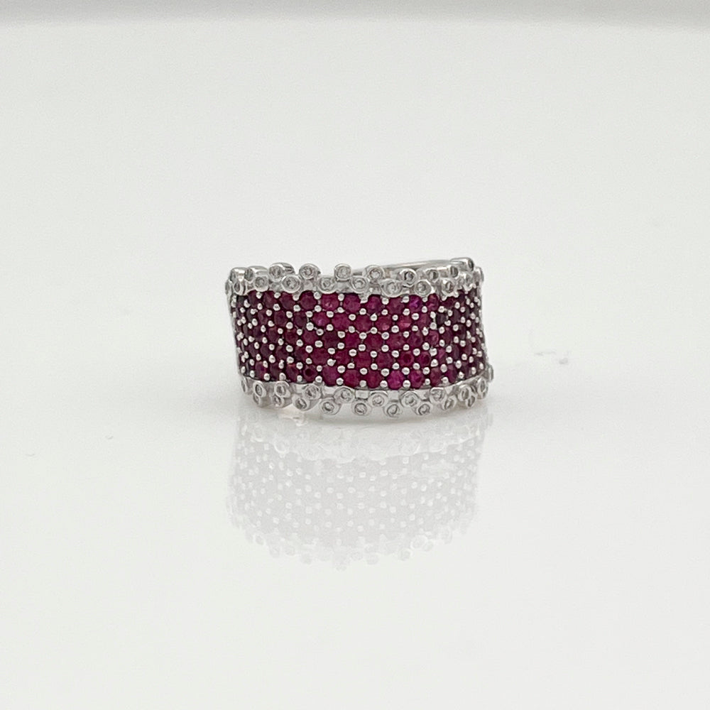 Discover the exquisite elegance of the ReMARKable Estate Color Gemstone Ring, a stunning piece crafted in 18 Karat White Gold. This ring showcases 80 round rubies totaling 1.00 carat, offering a vibrant splash of color. Complementing the rubies are 42 round diamonds with a total weight of 0.22 carats, rated H/I in color and VS2-SI1 in clarity, ensuring a breathtaking sparkle. Sized at 6.75 and with a width of 8.23mm, this ring is perfect for those who appreciate refined luxury.Each piece from ReMARKable Estate is a testament to superior craftsmanship and timeless design.Expert artisans meticulously set every gemstone, highlighting the natural beauty of both the rubies and diamonds.