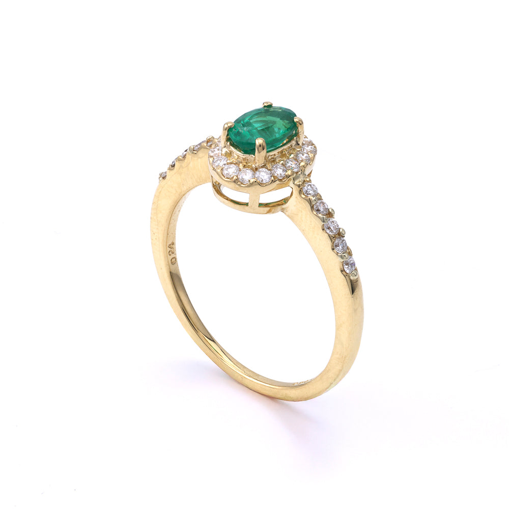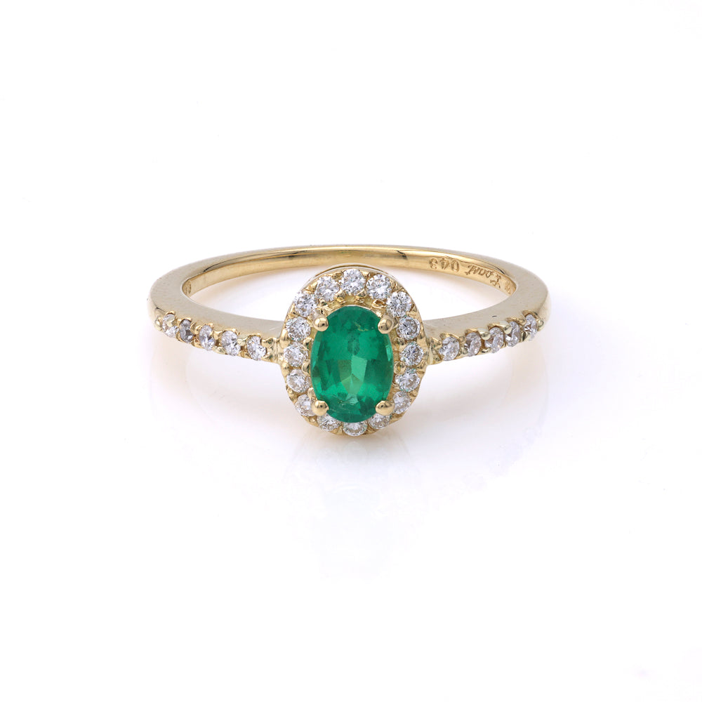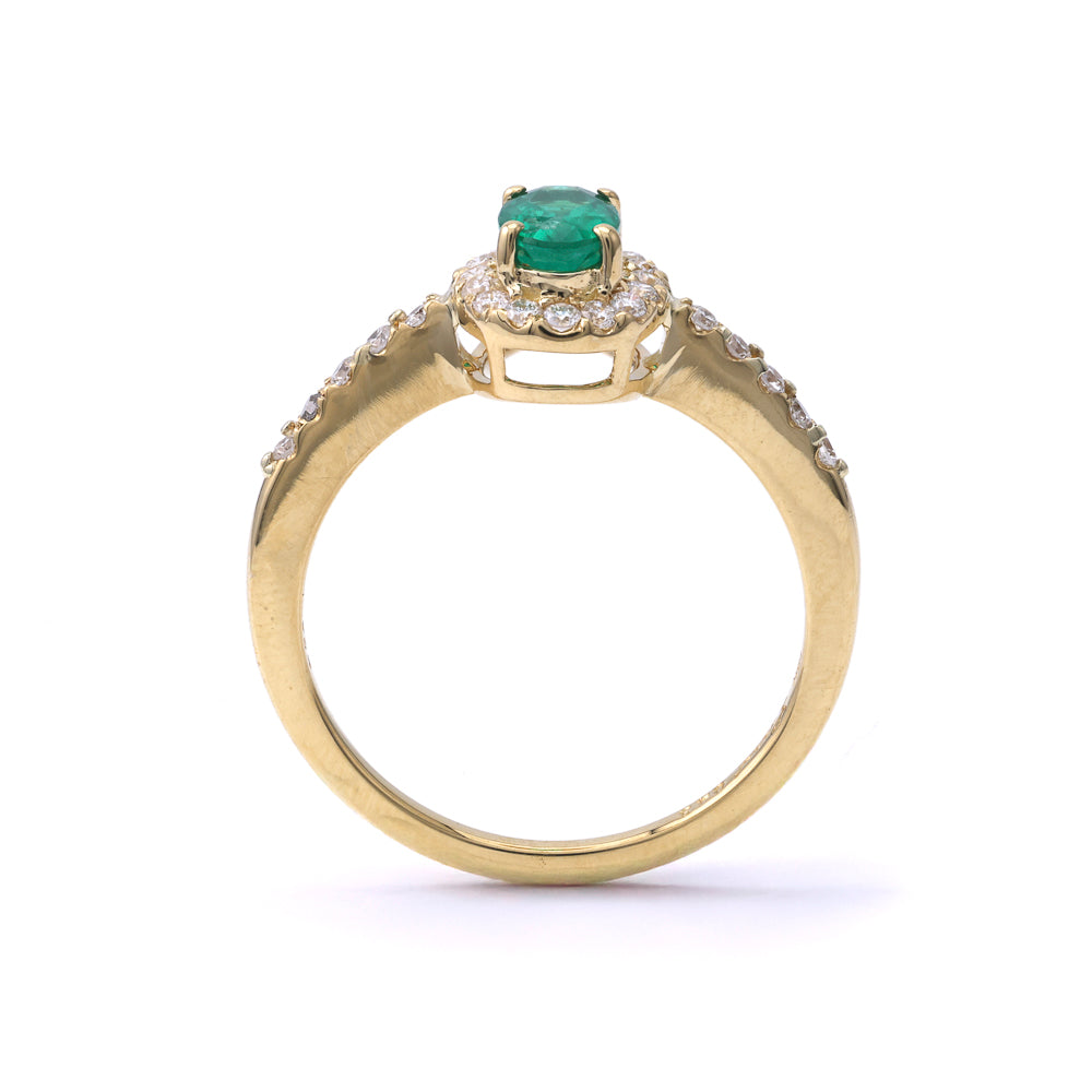 Color Gemstone Ring in 18 Karat Yellow with 1 Oval Emerald, totaling 0.43ctw and 26 Round Diamonds, Color: H/I, Clarity: SI1-SI2, totaling 0.24ctw Ring Size: 6.5 MM Width: 1.5 Collection: M Estate "This item is an estate piece of jewelry, often one-of-a-kind, and has been previously owned. It has been refurbished by our master jewelers to be enjoyed again."