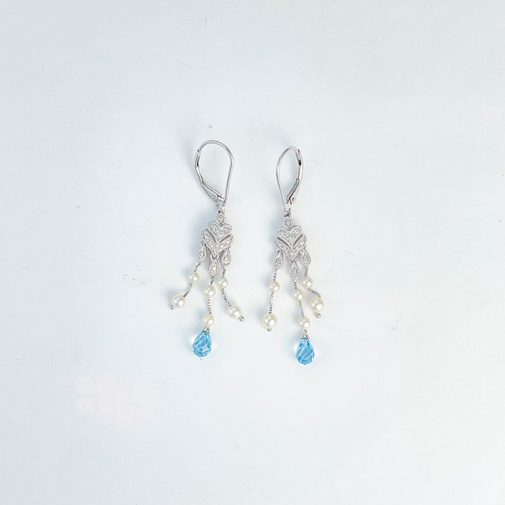 These exquisite dangle earrings from ReMARKable Estate are a captivating addition to any refined jewelry collection. Crafted in 14 Karat white gold, they feature two elegant tear drop aquamarines that beautifully catch the light. Complemented by 12 lustrous round pearls and 24 sparkling round diamonds, these earrings are a true masterpiece. The diamonds have a color grade of I/J and clarity ranging from VS2 to SI1, totaling 0.10 carats. A secure leverback closure ensures these earrings are as practical as they are beautiful.