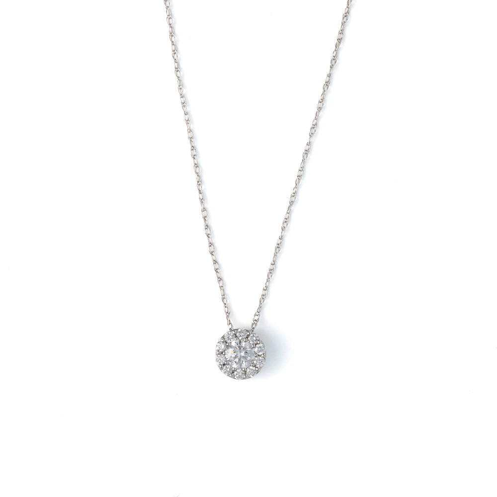 Lab-Grown Diamond Necklace in 14 Karat White with 11 Round Lab Grown Diamonds, Color: H/I, Clarity: SI1-SI2, totaling 0.25ctw Chain Type: Pendant Rope Chain Length: 18 Clasp Type: Spring Ring Necklace Type: Pendant Collection: M Estate "This item is an estate piece of jewelry, often one-of-a-kind, and has been previously owned. It has been refurbished by our master jewelers to be enjoyed again."