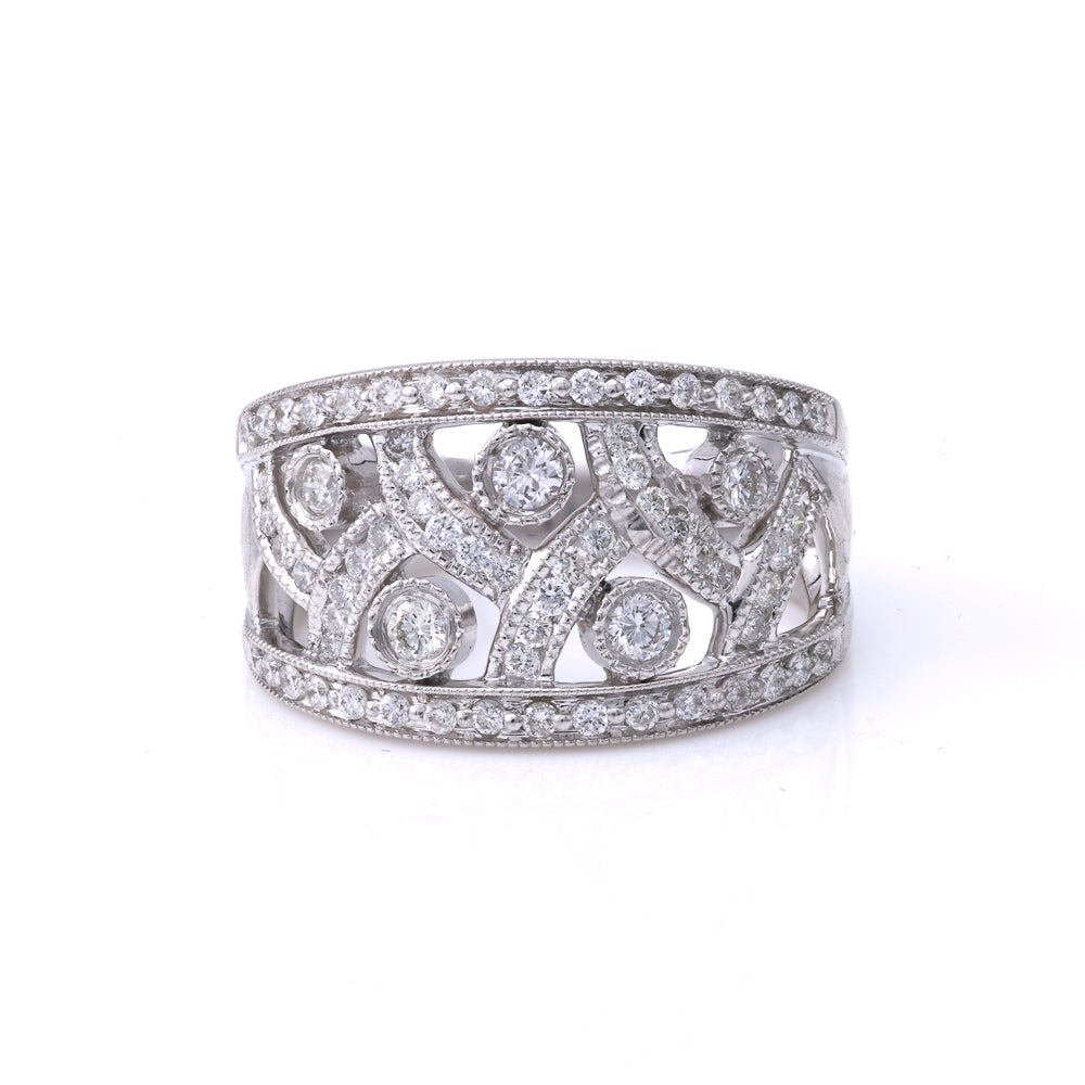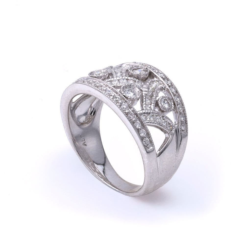 Natural Diamond Fashion Ring in 14 Karat White with 68 Round Diamonds, Color: H/I, Clarity: SI1-SI2, totaling 0.90ctw Ring Size: 5.5 MM Width: 12.15 Collection: M Estate "This item is an estate piece of jewelry, often one-of-a-kind, and has been previously owned. It has been refurbished by our master jewelers to be enjoyed again."