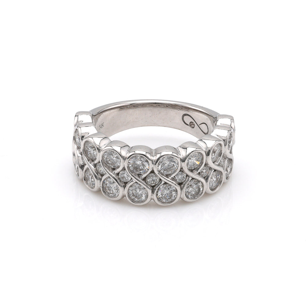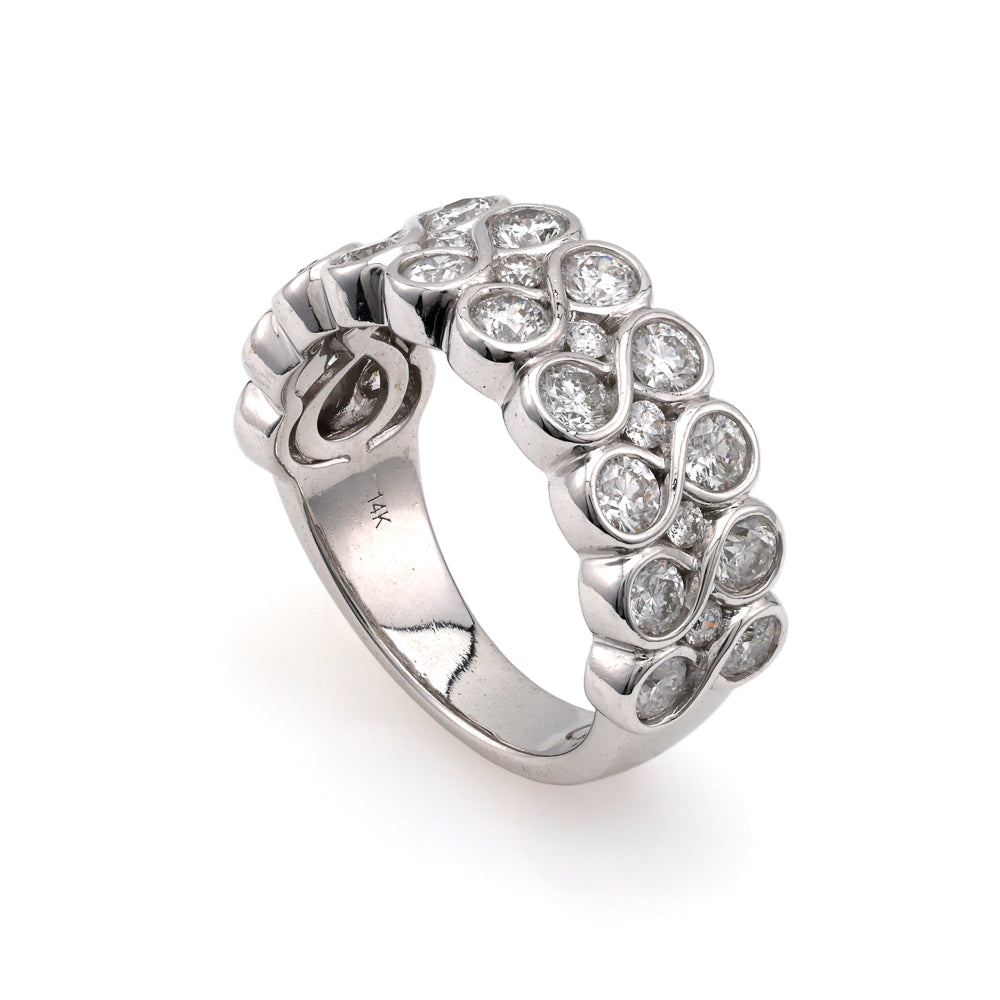 Discover the timeless allure of the Marks Estate Dept 1 Natural Diamond Fashion Ring, an exquisite piece that perfectly embodies elegance and sophistication. This stunning ring showcases 29 square cushion-cut natural diamonds, weighing a total of 2.00 carats. With a captivating G/H color grade and SI1-SI2 clarity, these gems sparkle brilliantly, captivating onlookers with every movement. Crafted in sumptuous 14 Karat White Gold, the ring exudes a luxurious glow, while its 8.5mm width and size 6.75 ensure a comfortable fit for any wearer.