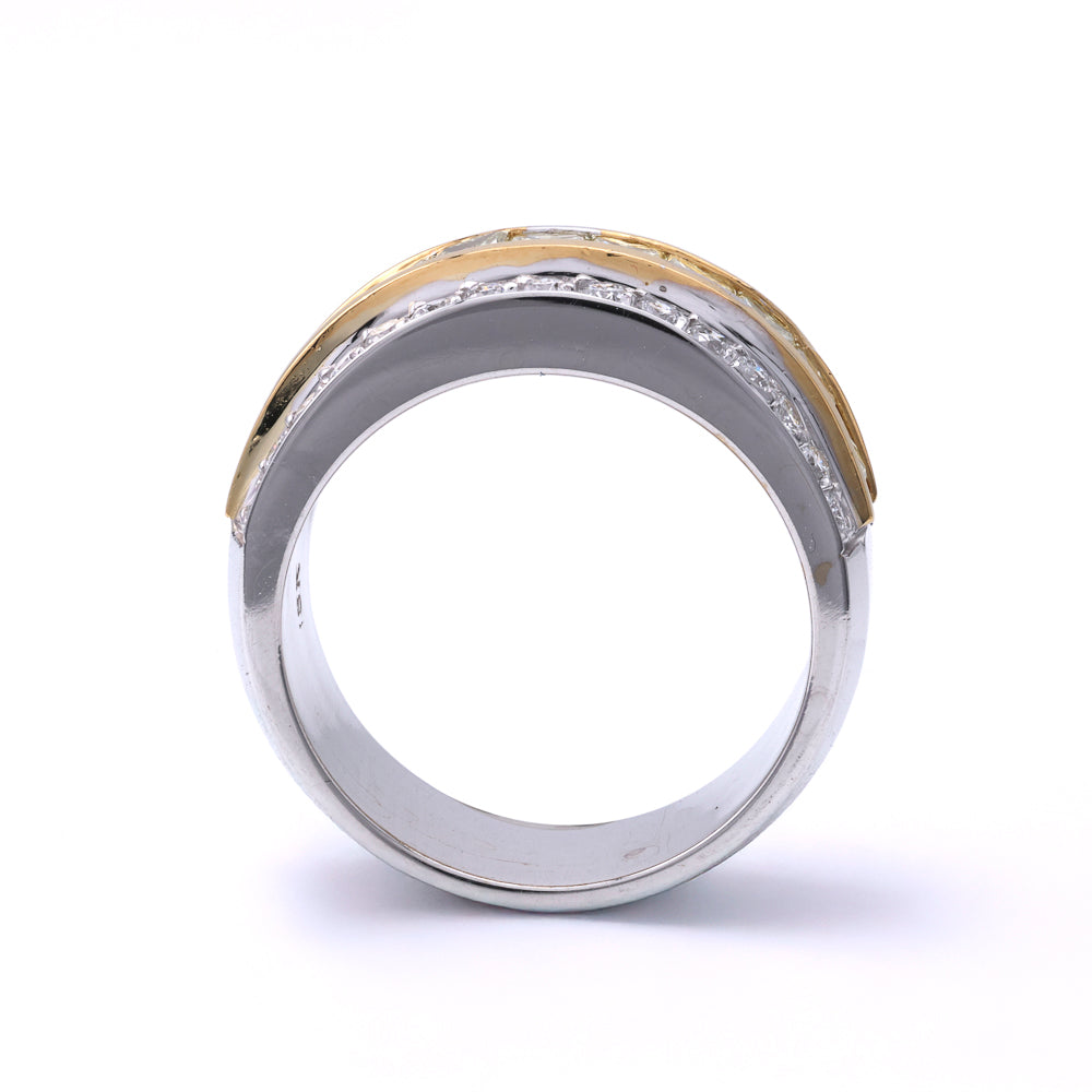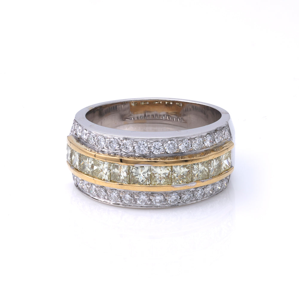 The ReMARKable Estate Natural Diamond Band is a stunning piece of artistry, crafted from luxurious 18 Karat to 20 Karat white and yellow gold. This exquisite band showcases 11 princess-cut natural yellow diamonds with a remarkable clarity of VS1-VS2, totaling an impressive 1.80 carats. Complementing these are 30 round diamonds with a pristine E/F color and the same VS1-VS2 clarity, adding up to 0.60 carats. With a width of 10.44mm and a comfortable ring size of 9.25, this band seamlessly blends sophistication with timeless elegance.