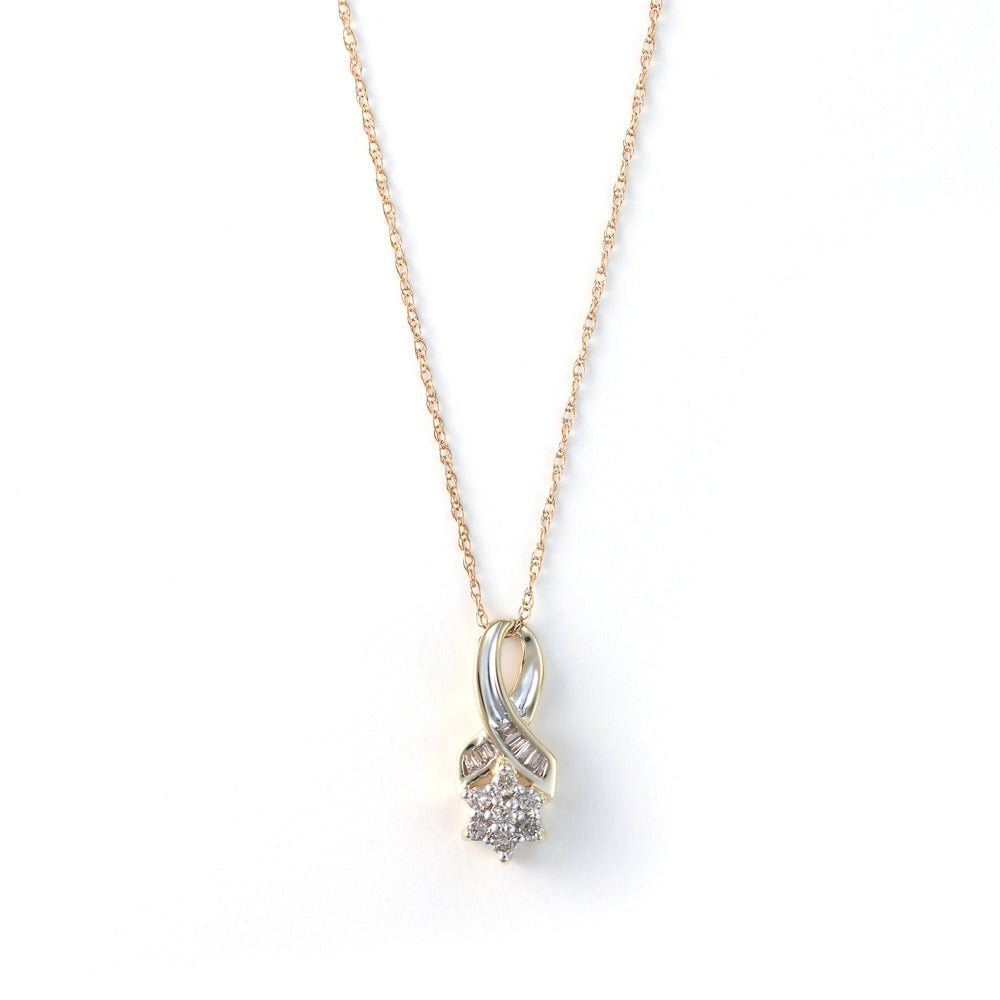 Natural Diamond Necklace in 10 Karat Yellow with 13 Various Shapes Diamonds, Color: J/K, Clarity: I1-I2, totaling 0.15ctw Chain Type: Pendant Rope Chain Length: 18 Clasp Type: Spring Ring Necklace Type: Pendant Collection: M Estate "This item is an estate piece of jewelry, often one-of-a-kind, and has been previously owned. It has been refurbished by our master jewelers to be enjoyed again."